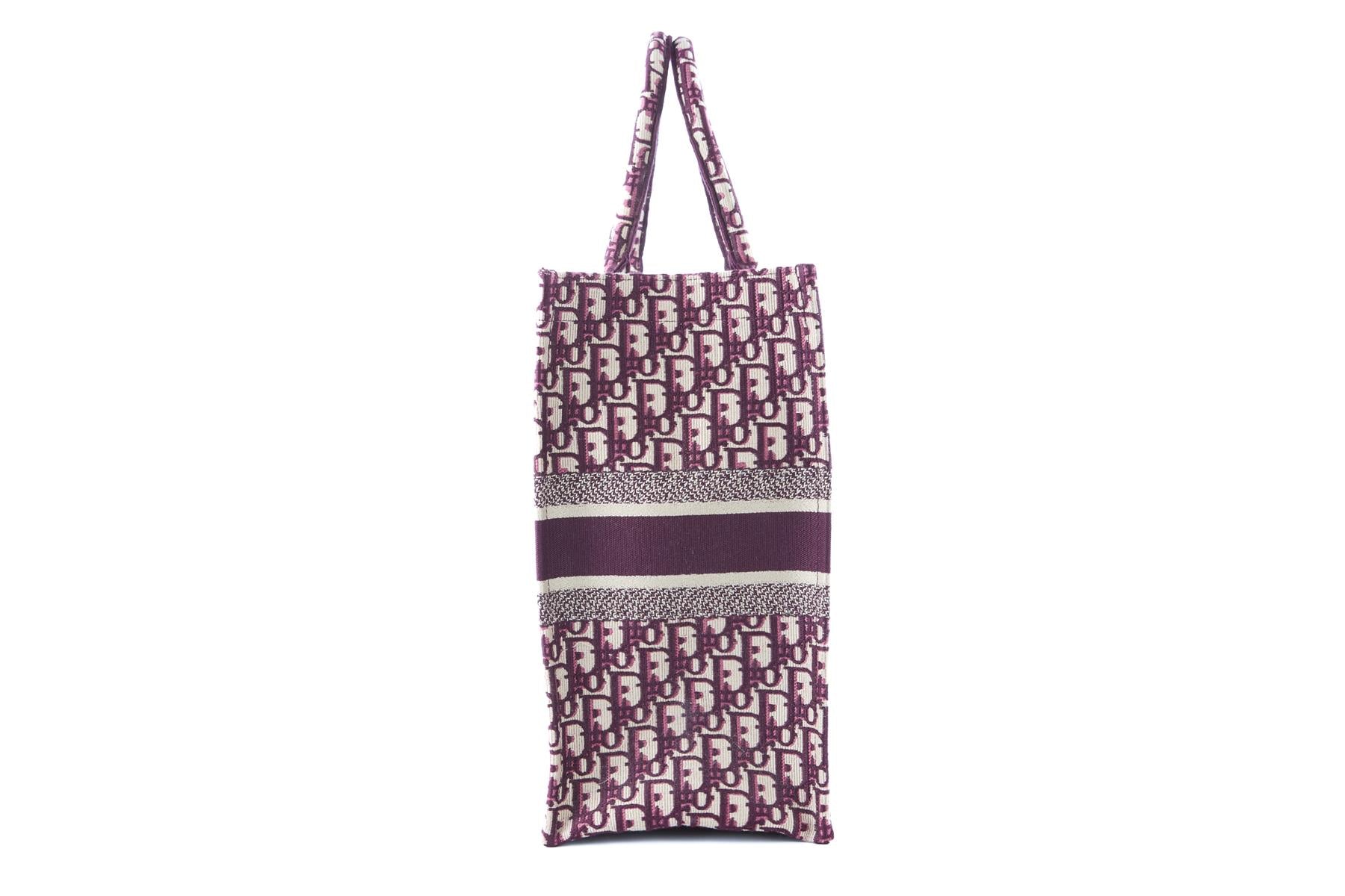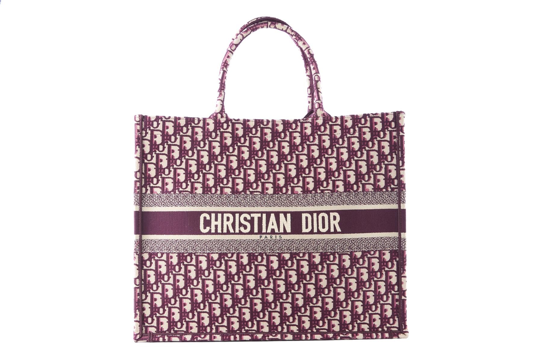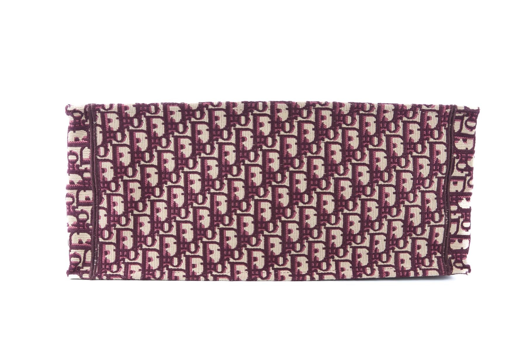 Christian Dior Burgundy Book Large Oblique Canvas Tote Bag. Burgundy and beige. Open Top. Does not come with - dustbag or box. Book Tote. Height: 13.75 in. Width: 16.5 in. Depth: 6.5 in. Handle drop: 6.25 in.