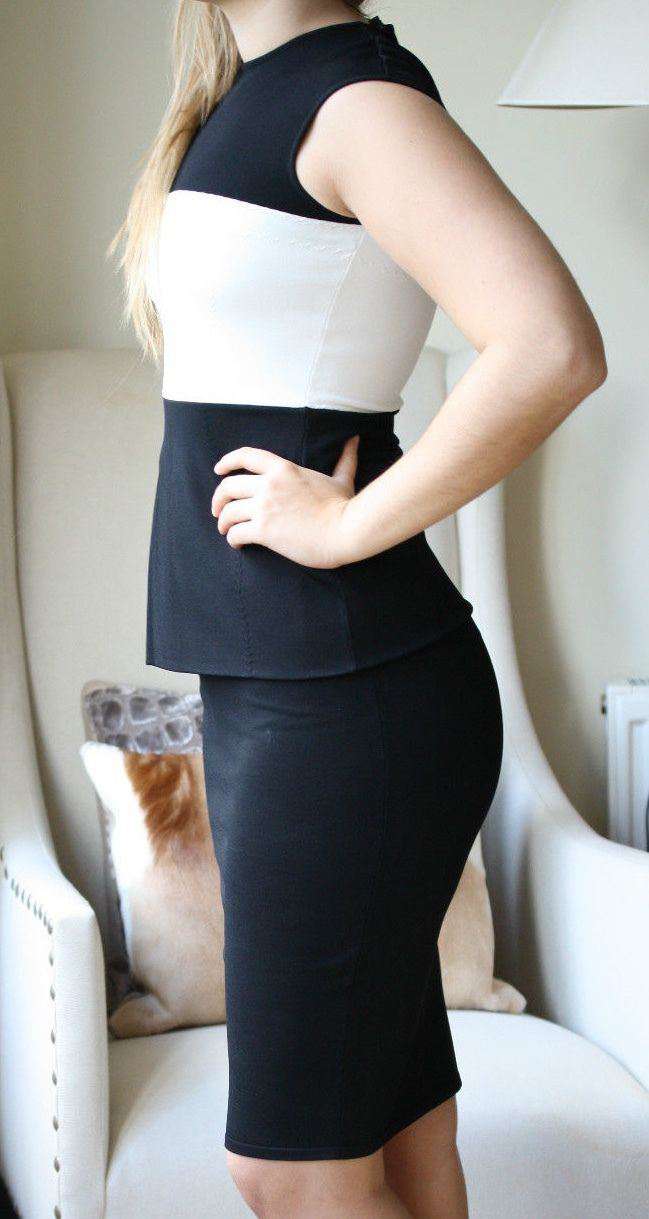 This black peplum top dress will be super useful in the coming season. Designed as a top and skirt will take you stylishly through the day and is dressy enough for the evening. Has a small round-neck and is unlined. The strong stretchy fabric will mould to your shape whilst keeping you firm. A must have for winter wardrobe.