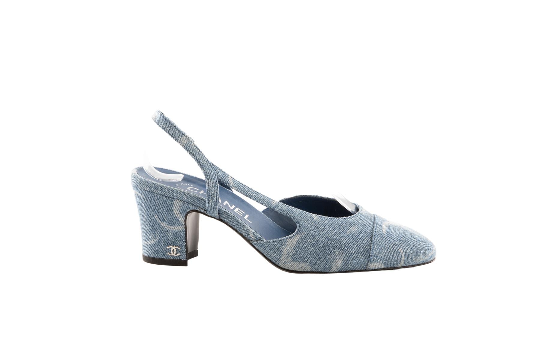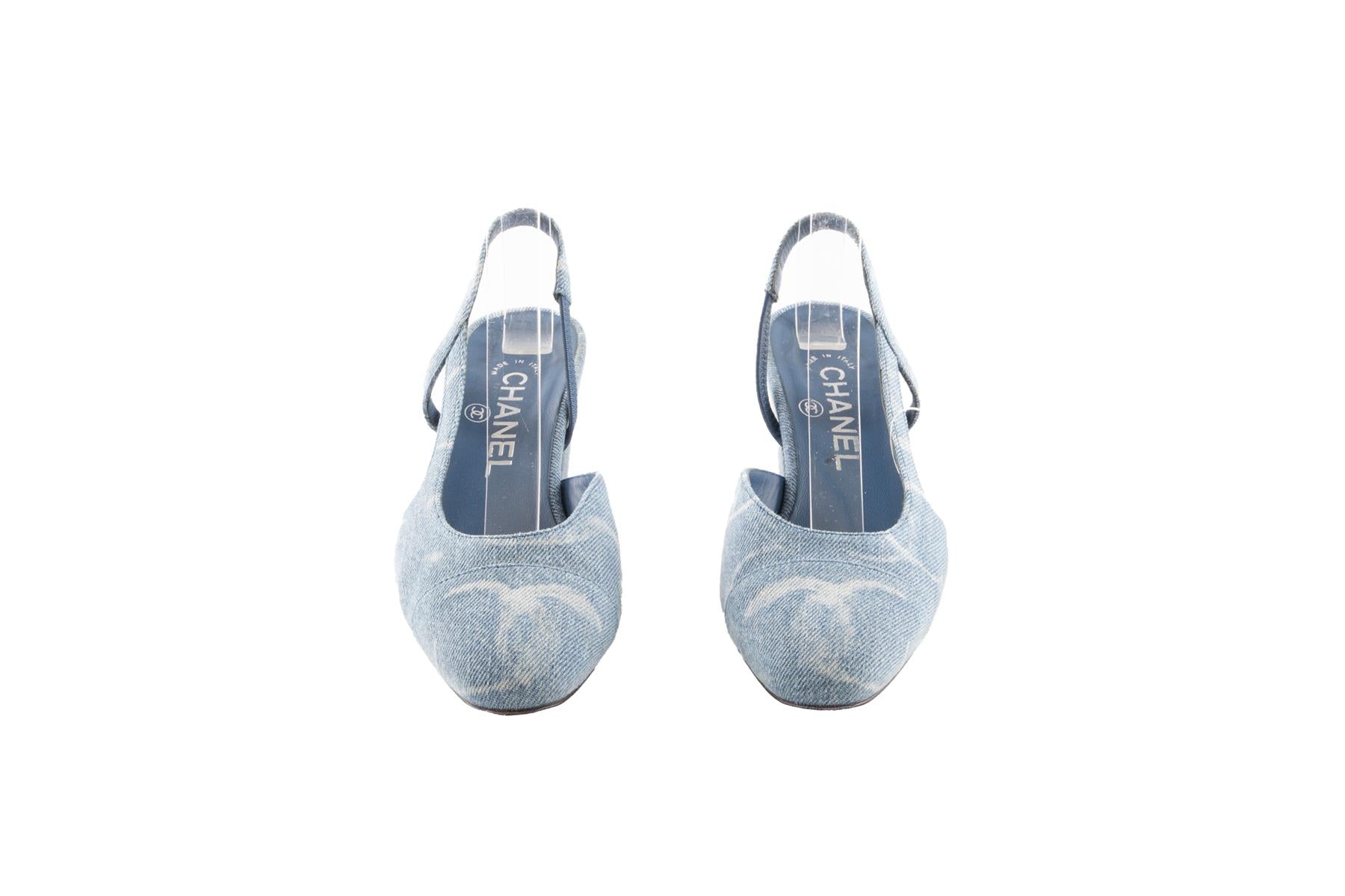 • Chanel Blue 2023 Cc Denim Slingback Pumps.