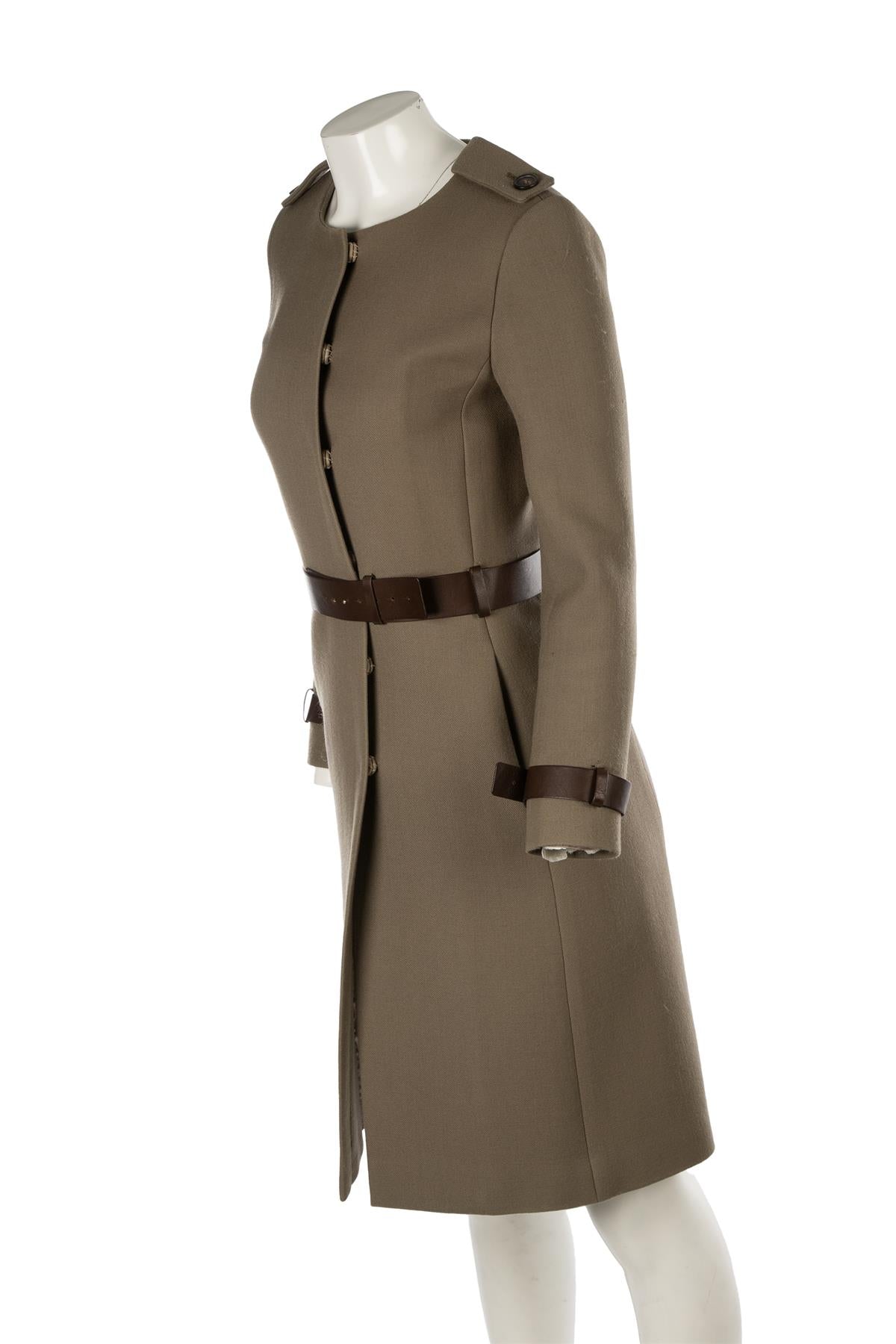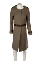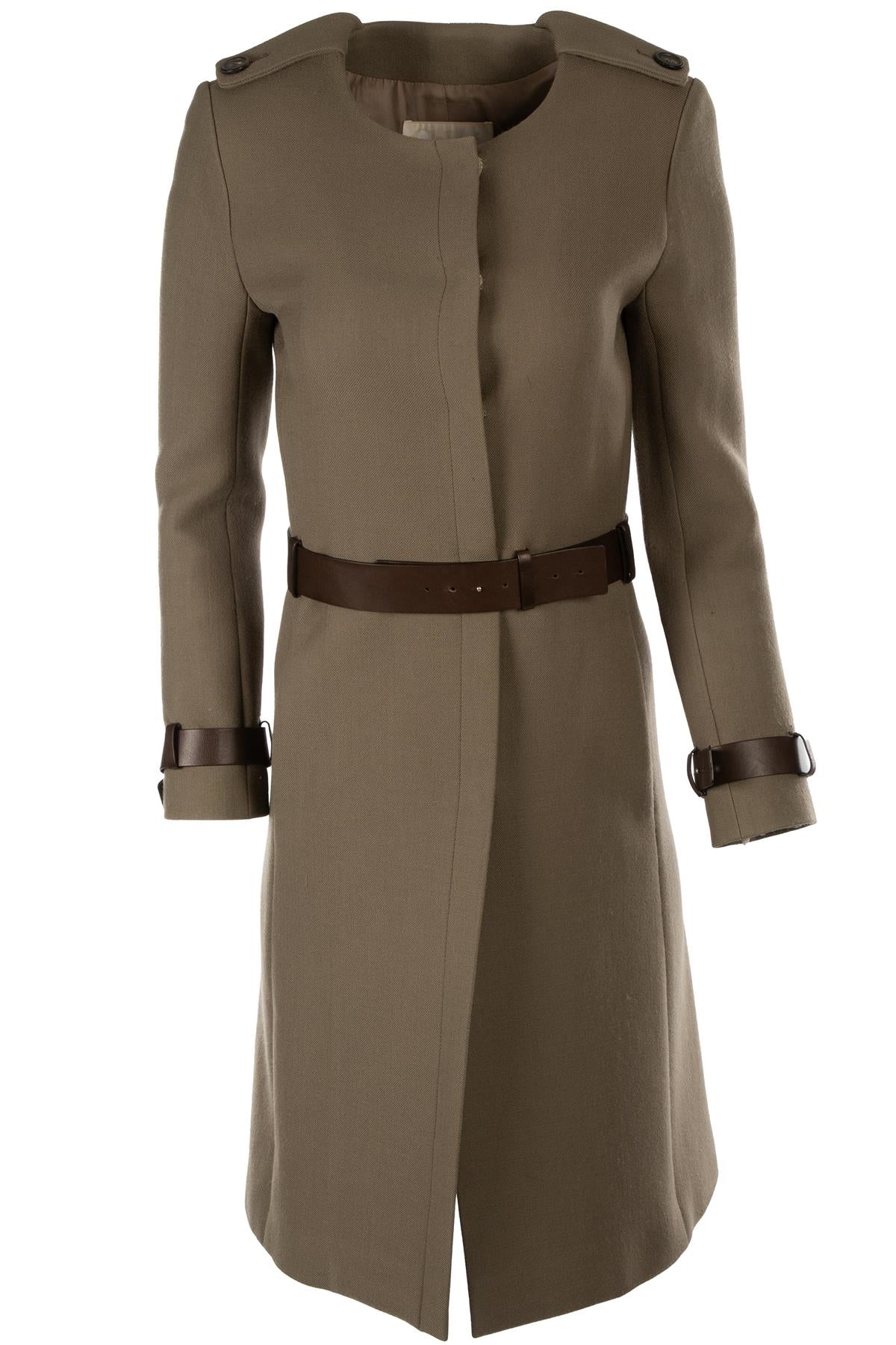 Chloé Green Wool Coat. Green. Long Sleeve. Crewneck. Snap button fastening - Front. 100% Wool, 100% Cupro. FR 36 (UK 8, US 2, IT 40). Shoulder to Shoulder: 15 in. Bust: 27 in. Waist: 38 in. Hips: 42 in. Length: 40 in.