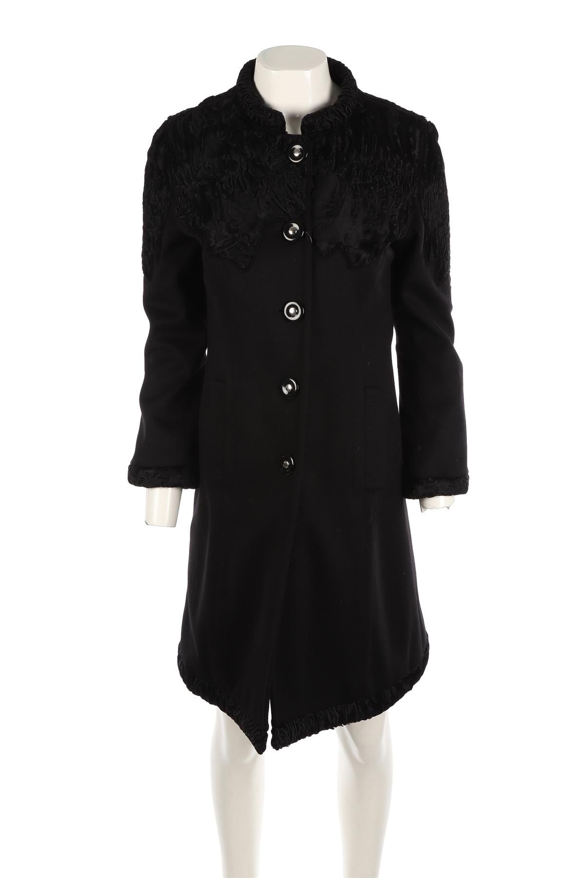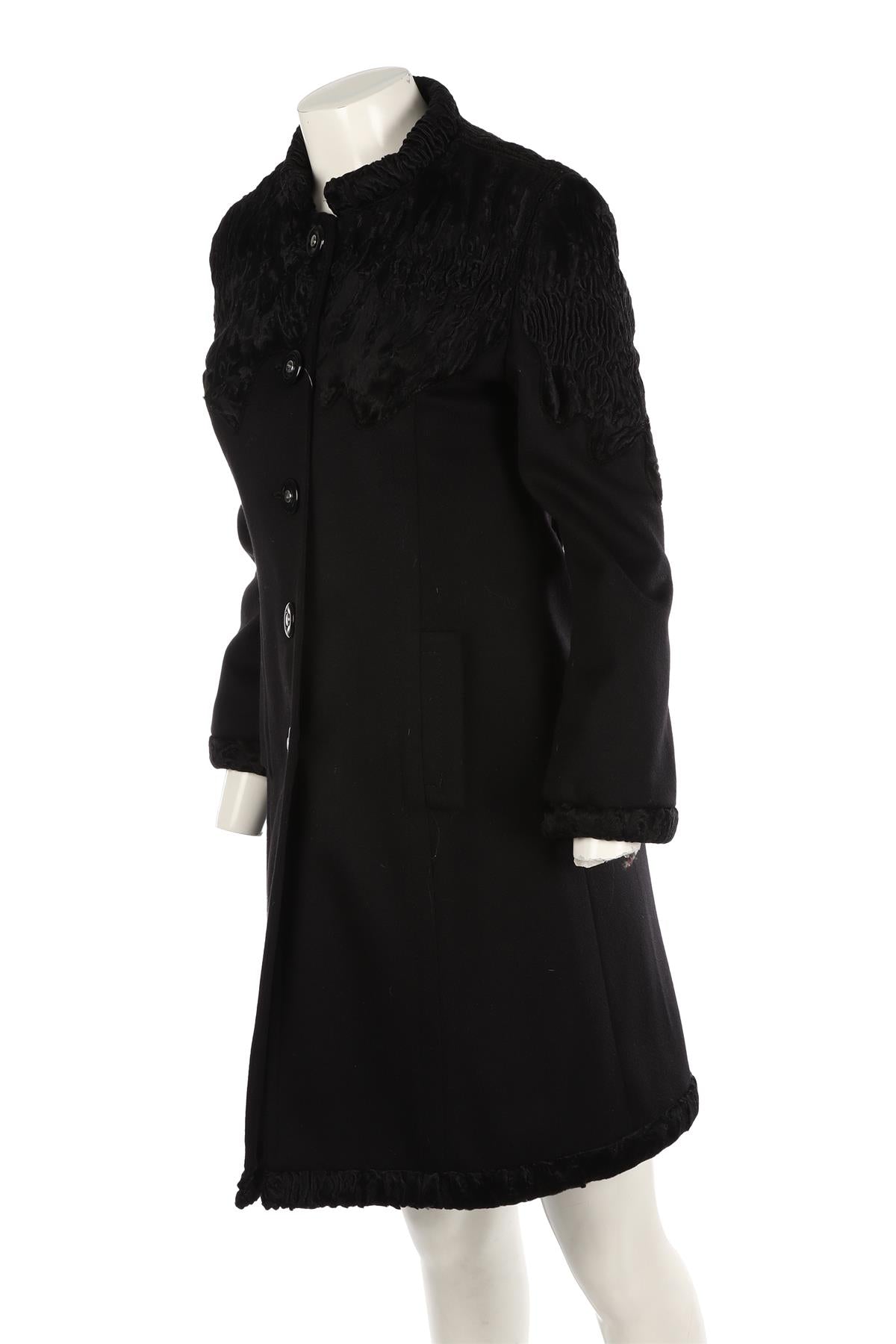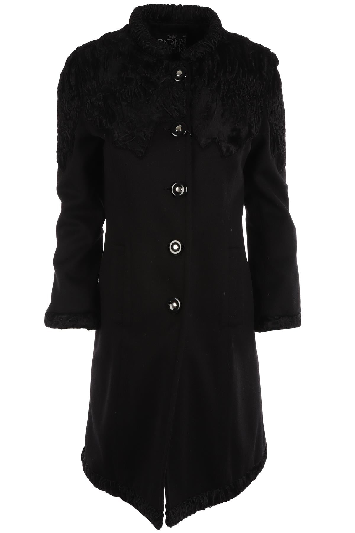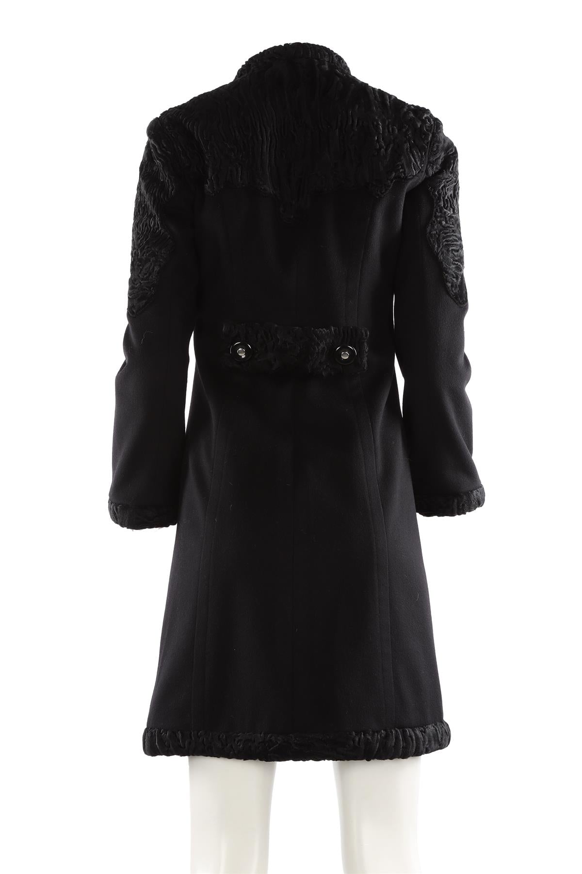 Fontana Couture Black Vintage Persian Lamb And Wool Coat. Black. Long Sleeve. Mock Neck. Button fastening - Front. No composition label. IT 40 (UK 8, US 4, FR 36). Shoulder to Shoulder: 15 in. Bust: 36 in. Waist: 32 in. Hips: 44 in. Length: 37 in.