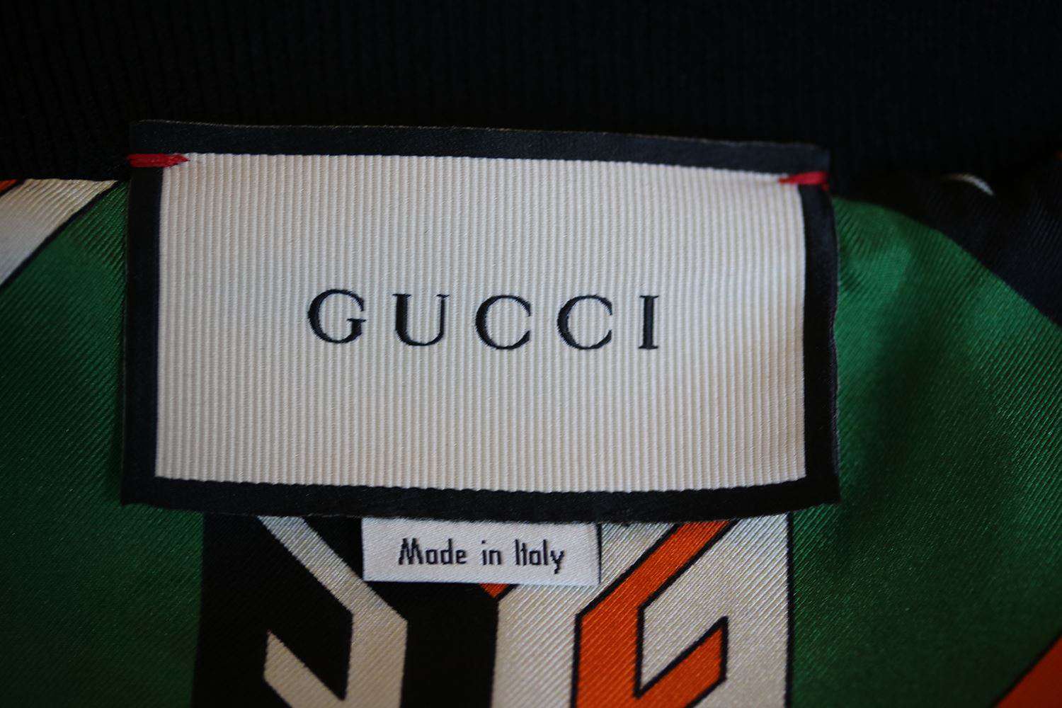 Gucci's bomber jacket is patterned with a rainbow chevron lurex stripe print on the front and a vintage green and tonal-blue 'GG Wallpaper' print from the archives. Made in Italy from lustrous duchesse-silk. Multicolored duchesse-silk. Zip fastening through front. Made in Italy.