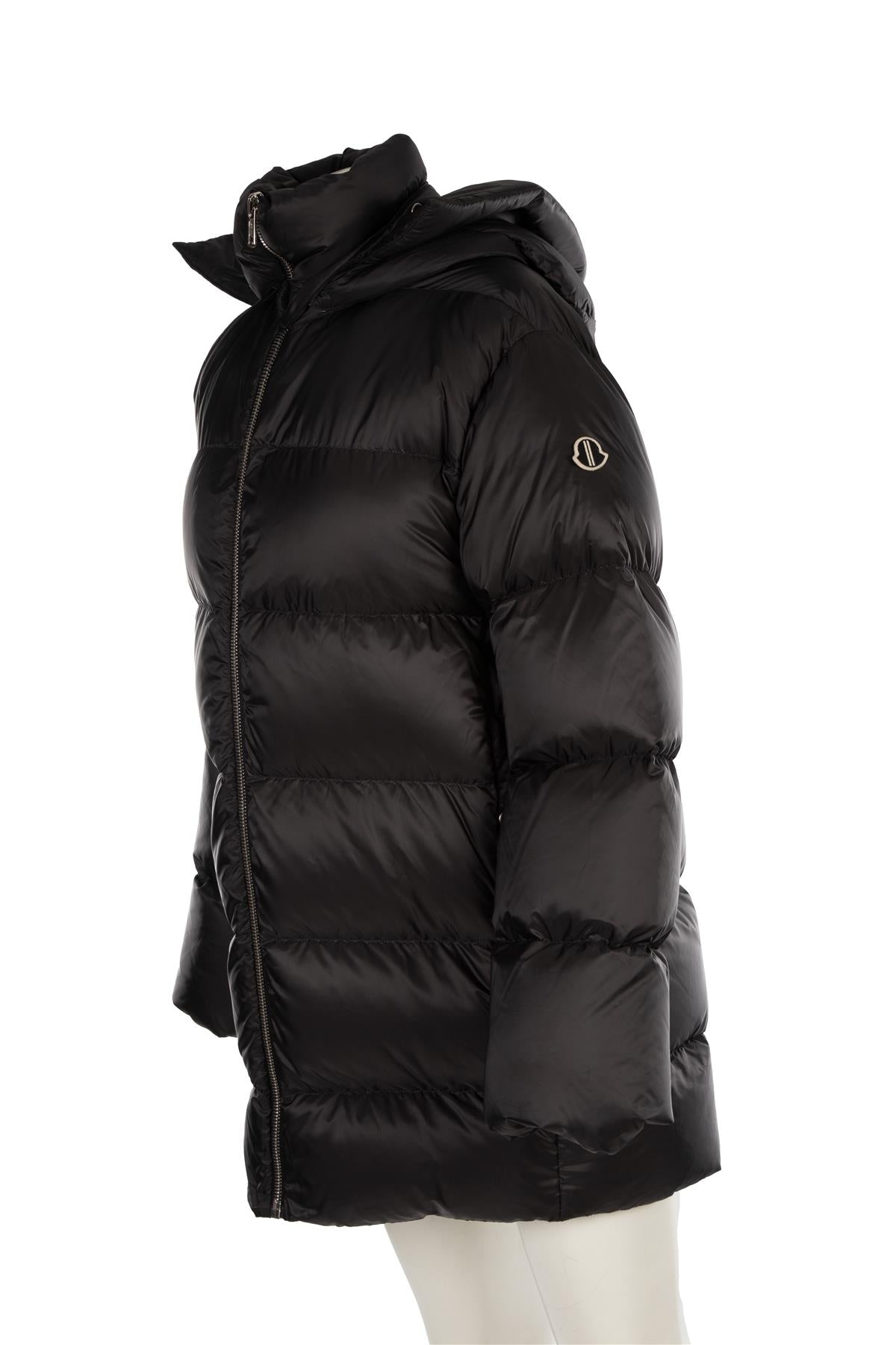 Rick Owens + Moncler Black Padded Down Coat. Black. Long Sleeve. Mock Neck. Zip fastening - Front. 100% Polyester, 46% Acrylic, 42% Wool, 10% Polyamide, 90% Down, 10% Feather. 0 (UK 6, US 2, FR 34, IT 38). Shoulder to Shoulder: 19 in. Bust: 48 in. Waist: 48 in. Hips: 44 in. Length: 33 in.