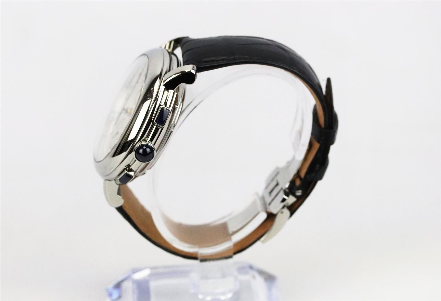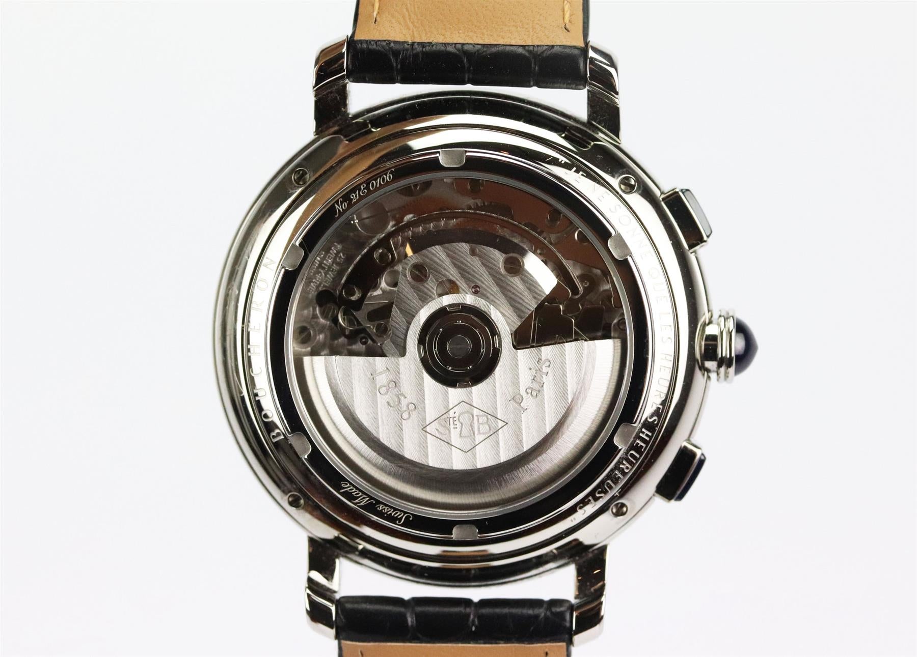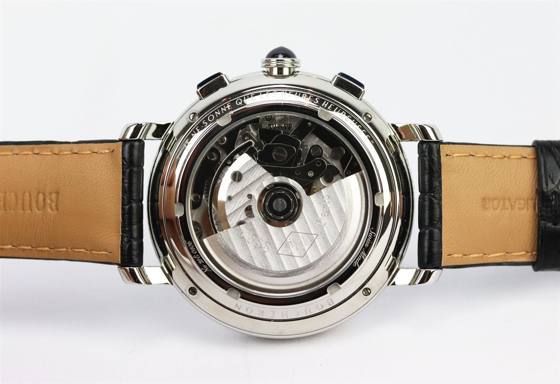- This 'Epure' 43mm timepiece by Boucheron has been crafted at the brand's Swiss atelier from stainless steel with an intricate automatic winding movement and has a white dial and finished with a black alligator strap and blue cabochon.