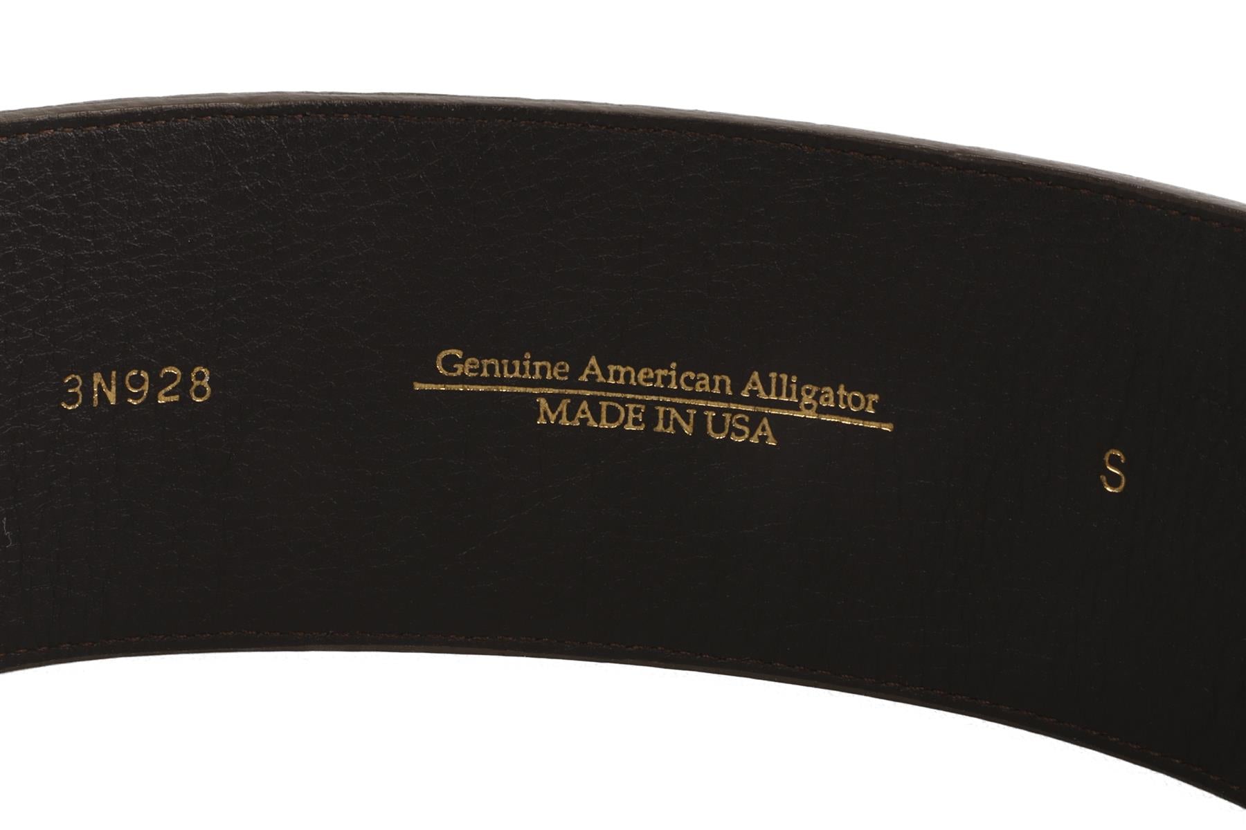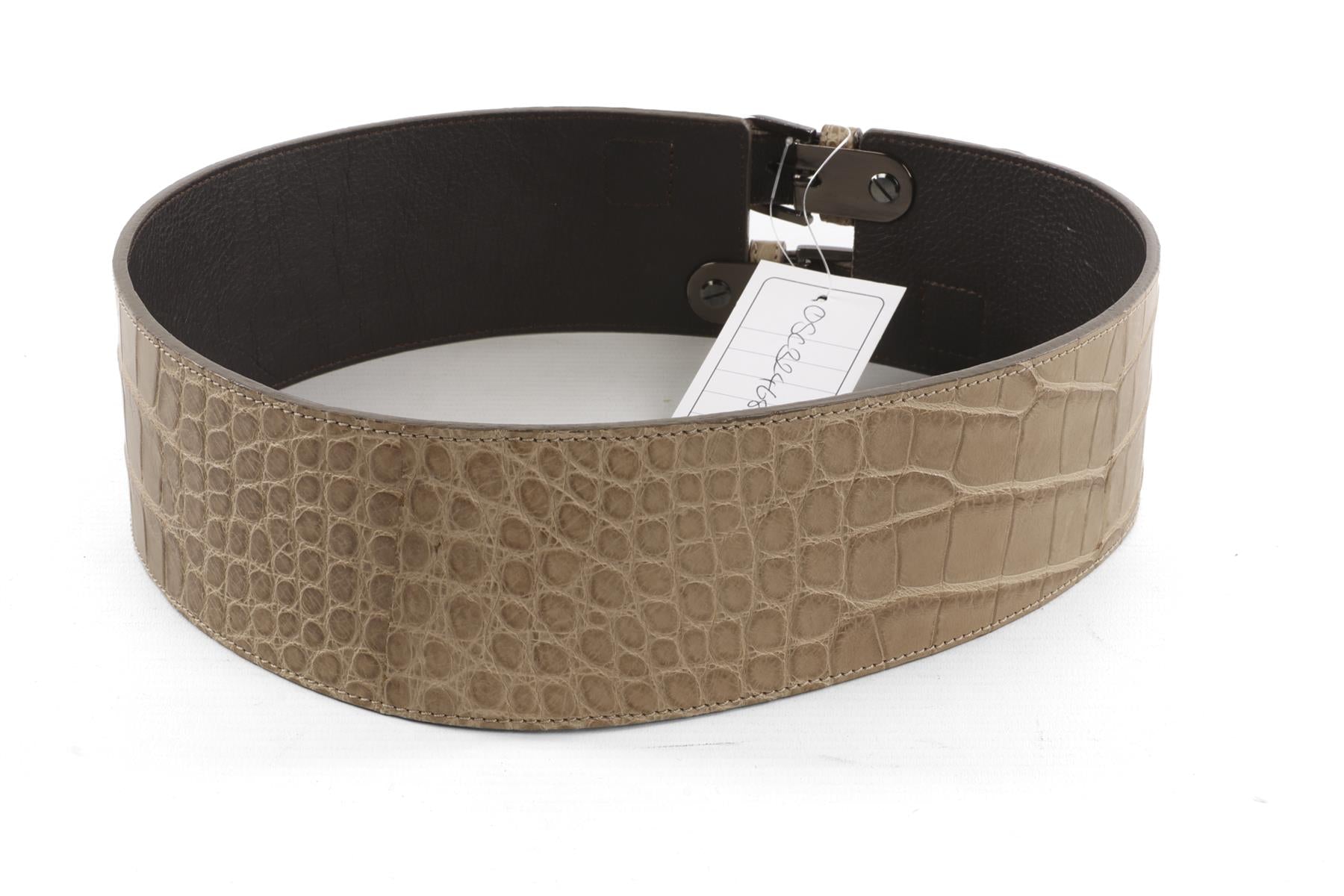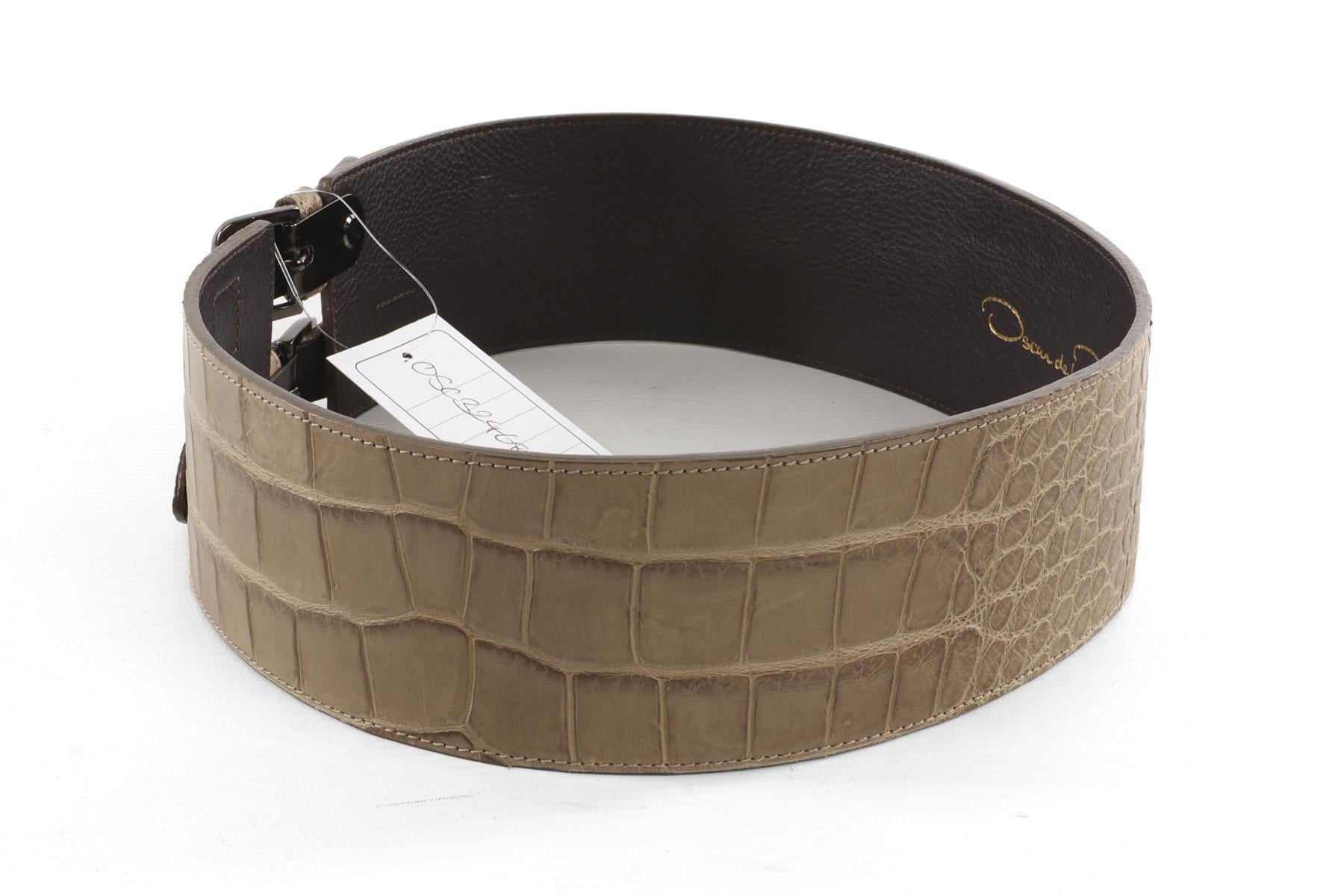 Oscar De La Renta Taupe Alligator Waist Belt. Taupe. Buckle fastening - Front. Small. Length: 28-30 in. Width: 2.5 in.
