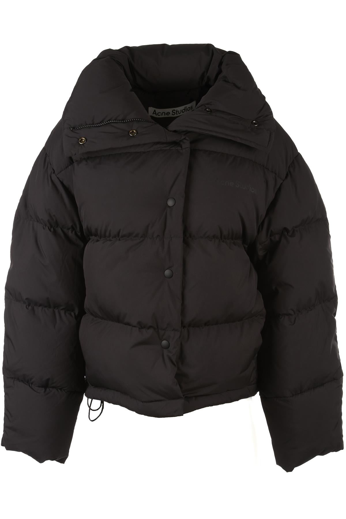 Acne Studios Black Olimera Padded Down Jacket. Black. Long Sleeve. Mock Neck. Button fastening - Front. 100% Nylon, 100% Polyester, 90% Duck down, 10% Feather. DE 32 (UK 6, US 2, FR 34, IT 38). Shoulder to Shoulder: 21 in. Bust: 42 in. Waist: 44 in. Hips: 44 in. Length: 23 in.