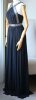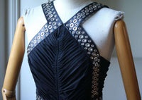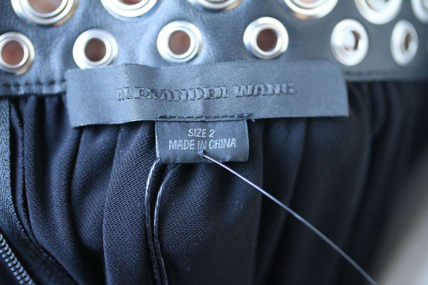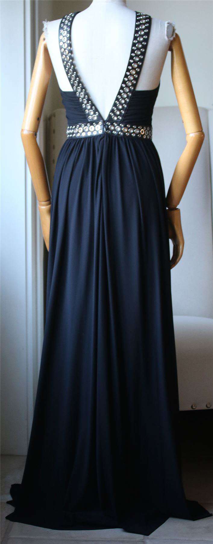 Alexander Wang black gown. Stretch-crepe, leather. Silver eyelet-embellished shoulder straps and waistband, ruched front and waistband. Concealed hook and zip fastening at back.