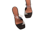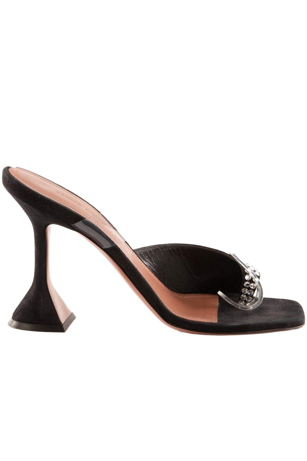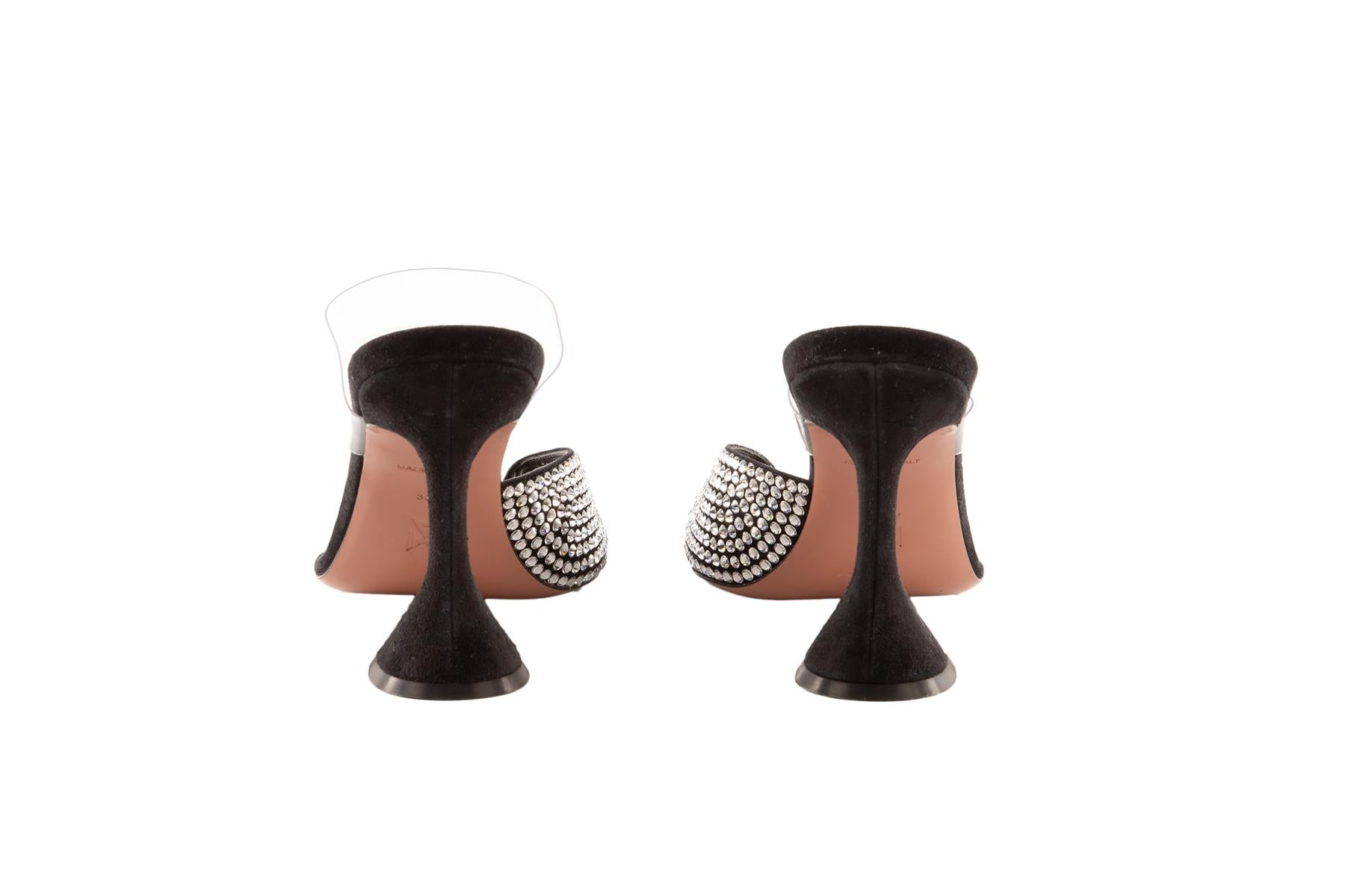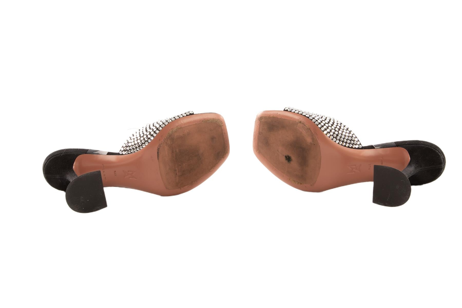Amina Muaddi Black Suede Sandals. Black. Slips on. Comes with - dustbag. EU 35.5 (UK 2.5, US 5.5). Insole: 8.5 in. Heel Height: 4 in.
