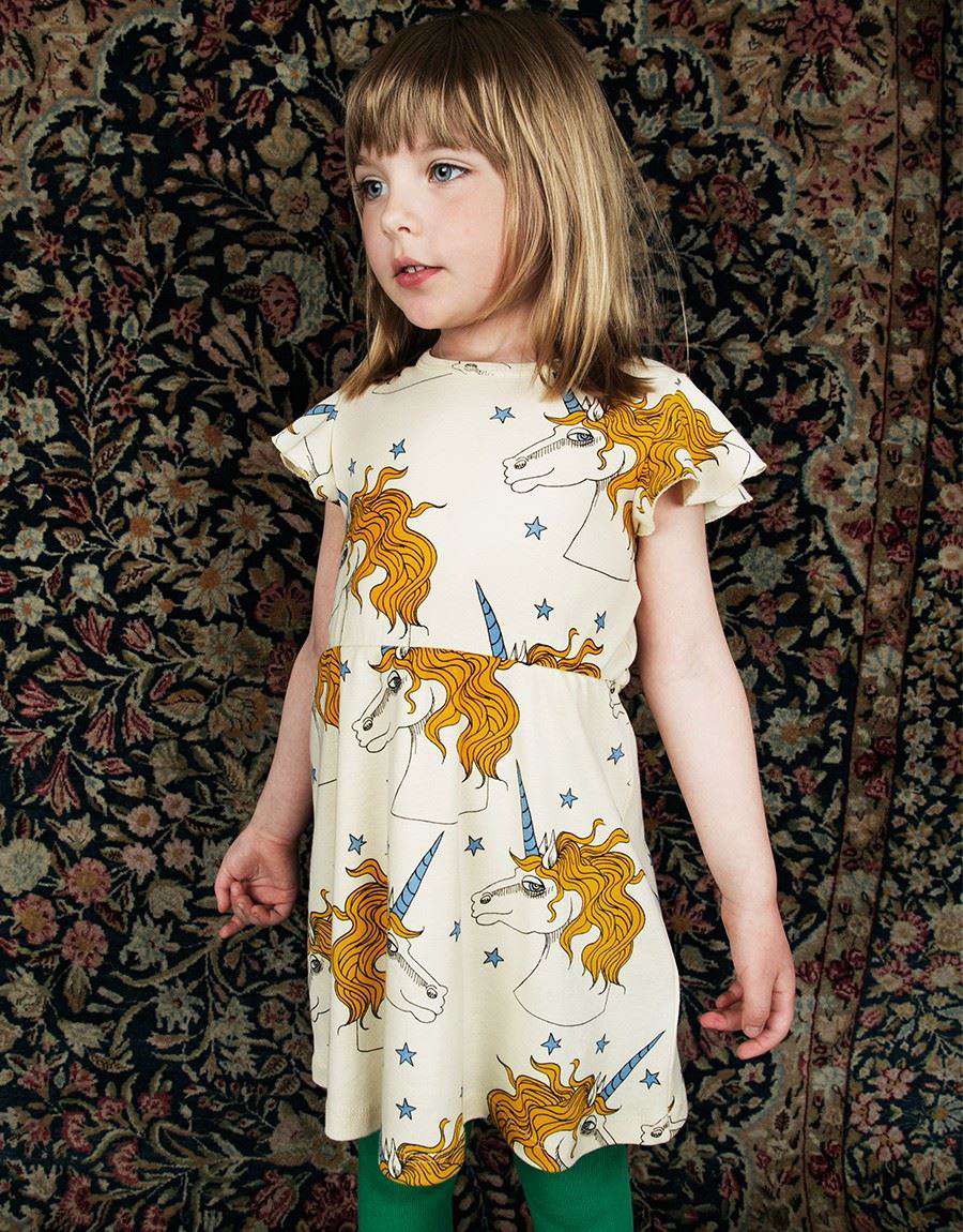 Off-white-colored dress by Mini Rodini. With short frill sleeves, a gathered waist and printed stars and unicorns. The dress has snap buttons at the back for easy dressing and is made of 100% organic cotton.