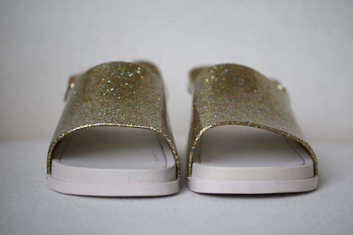 Fun gold glitter jelly slider sandals, with the unique and unmistakable Mini Melissa scent. Made in soft and flexible PVC, they have an adjustable strap that fastens with velcro.