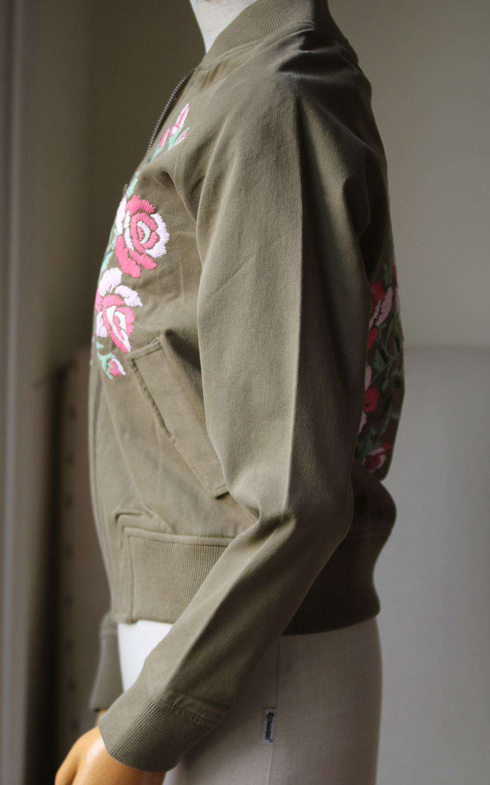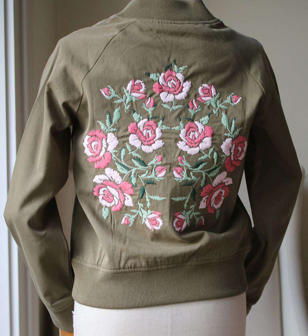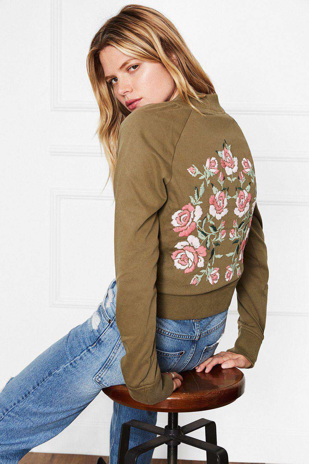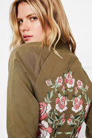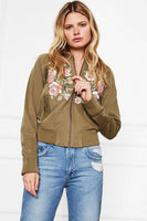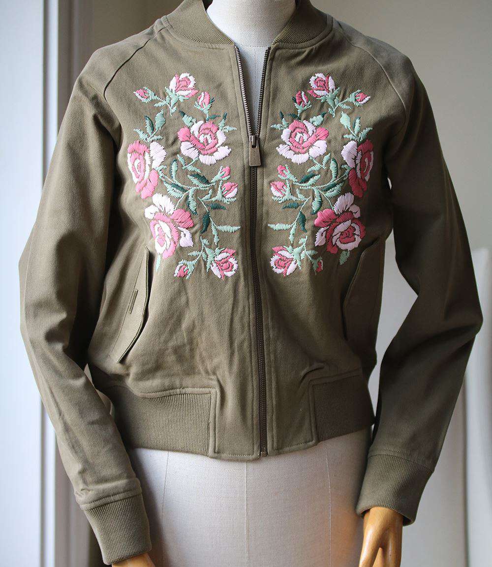 A flawless contrast of feminine floral meets a touch of tomboy to create this killer embroidered bomber jacket. Featuring detailed floral appliques, gold hardware and lined for comfort, it's without a doubt that this jacket serves as the ultimate spring layer. 100% Cotton.