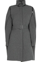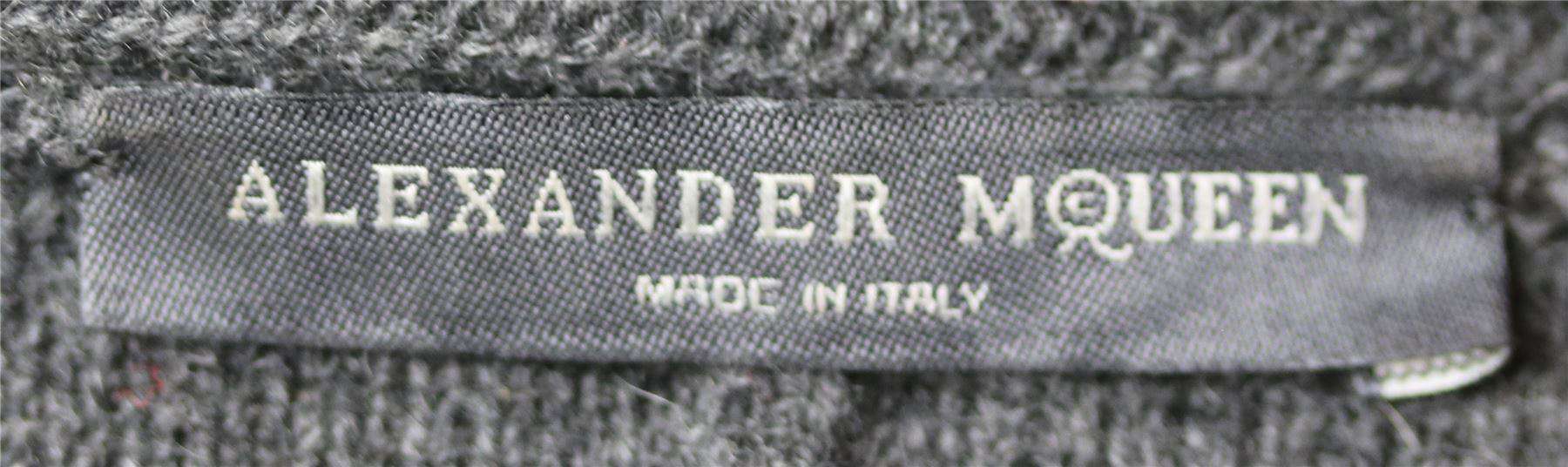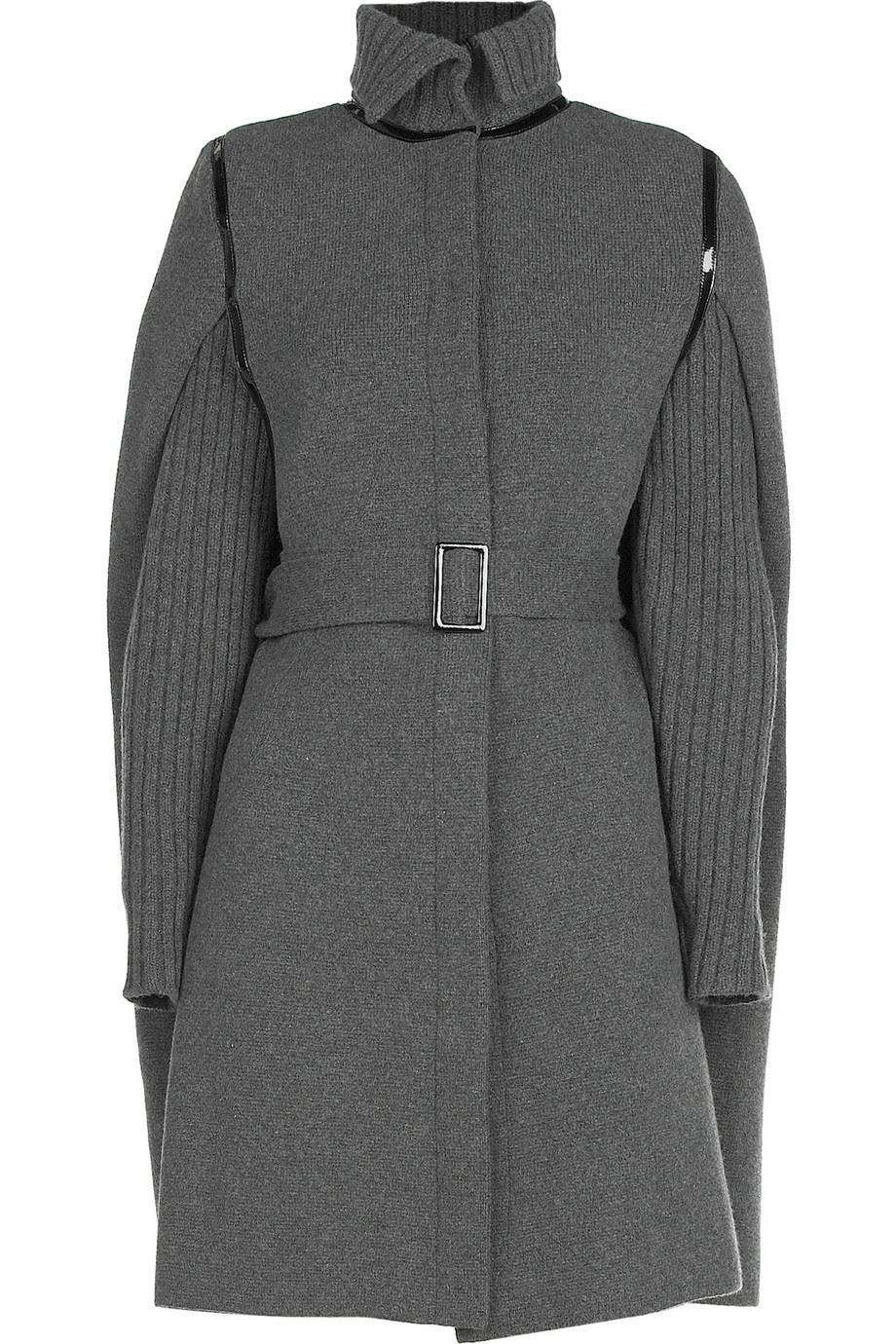A statement knit which can easily be worn as an outerwear piece for fall. Charcoal wool-and-cashmere blend cape with detachable hood, vented side seams and long ribbed sleeves. Alexander McQueen cape has black patent edged seams, a contrast ribbed trim, a high neck, a buckle fastening belt laced through waist and concealed press stud fastenings. 55% wool, 30% cashmere, 15% silk.