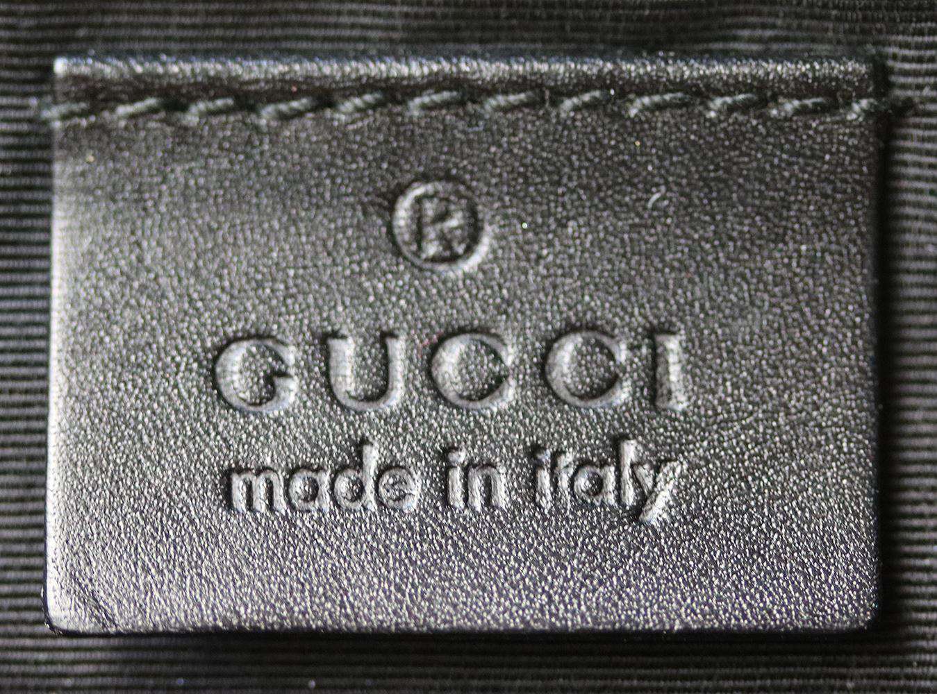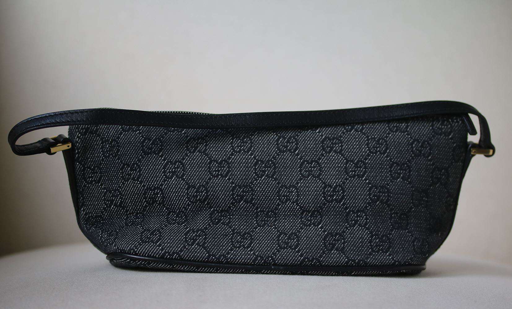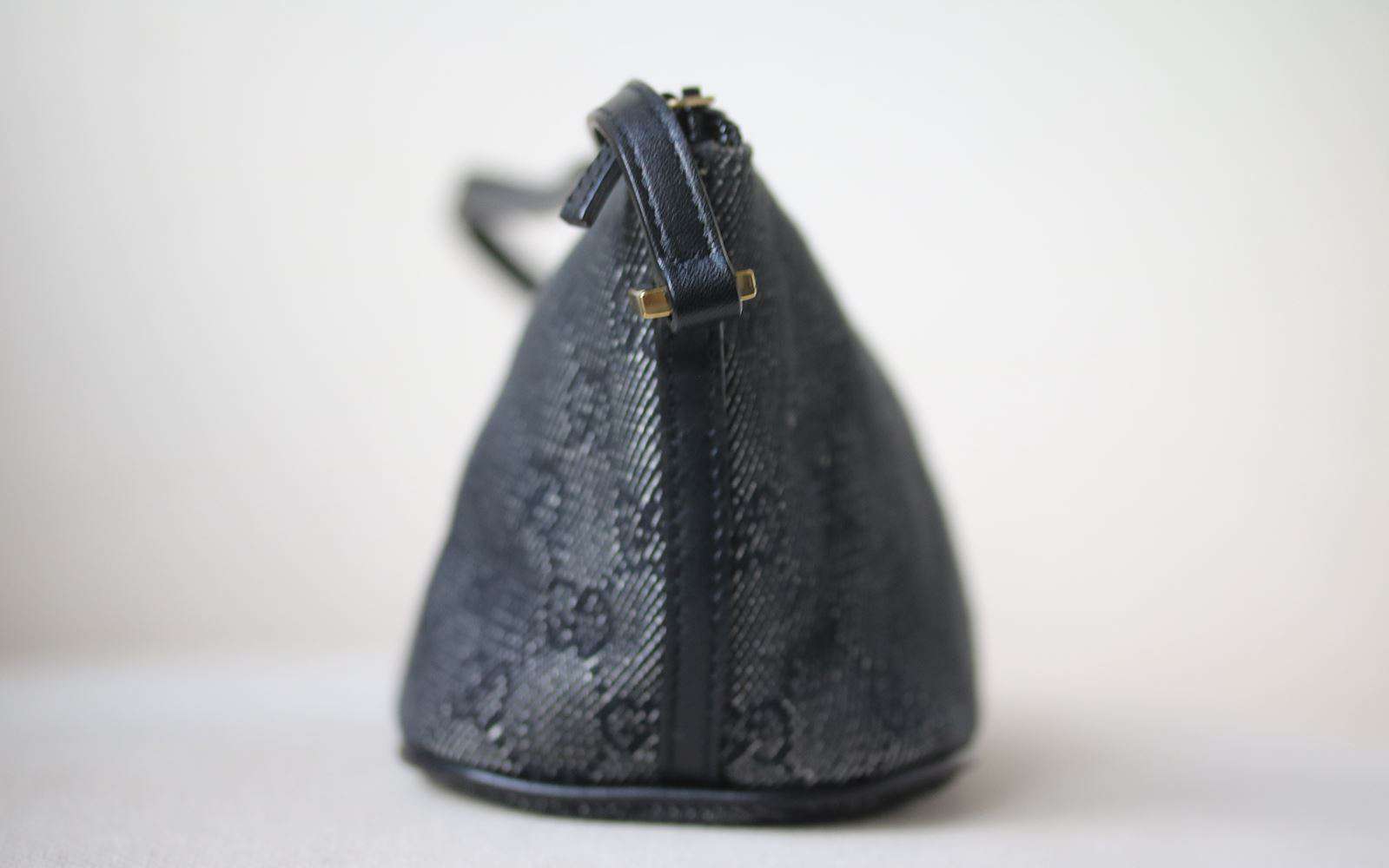 The perfect baguette in black monogram GG web canvas by Gucci and allows you to travel light and in style. Details: Gucci Black GG Web Monogram with leather trimmings and leather pipings. Shoulder strap with 4" drop. Made in Italy.