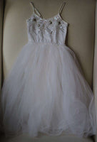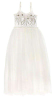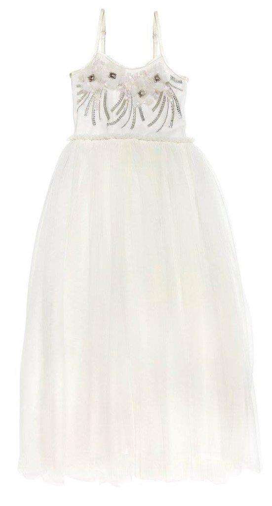 Our classic long tutu dress is re-incarnated in our Golden Cage Long Tutu Dress. Delicate fabric flowers with a silver sequin stem is the perfect bouquet for this delightful dress that is ideal for weddings, christenings or any special occasion.