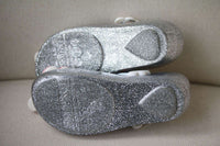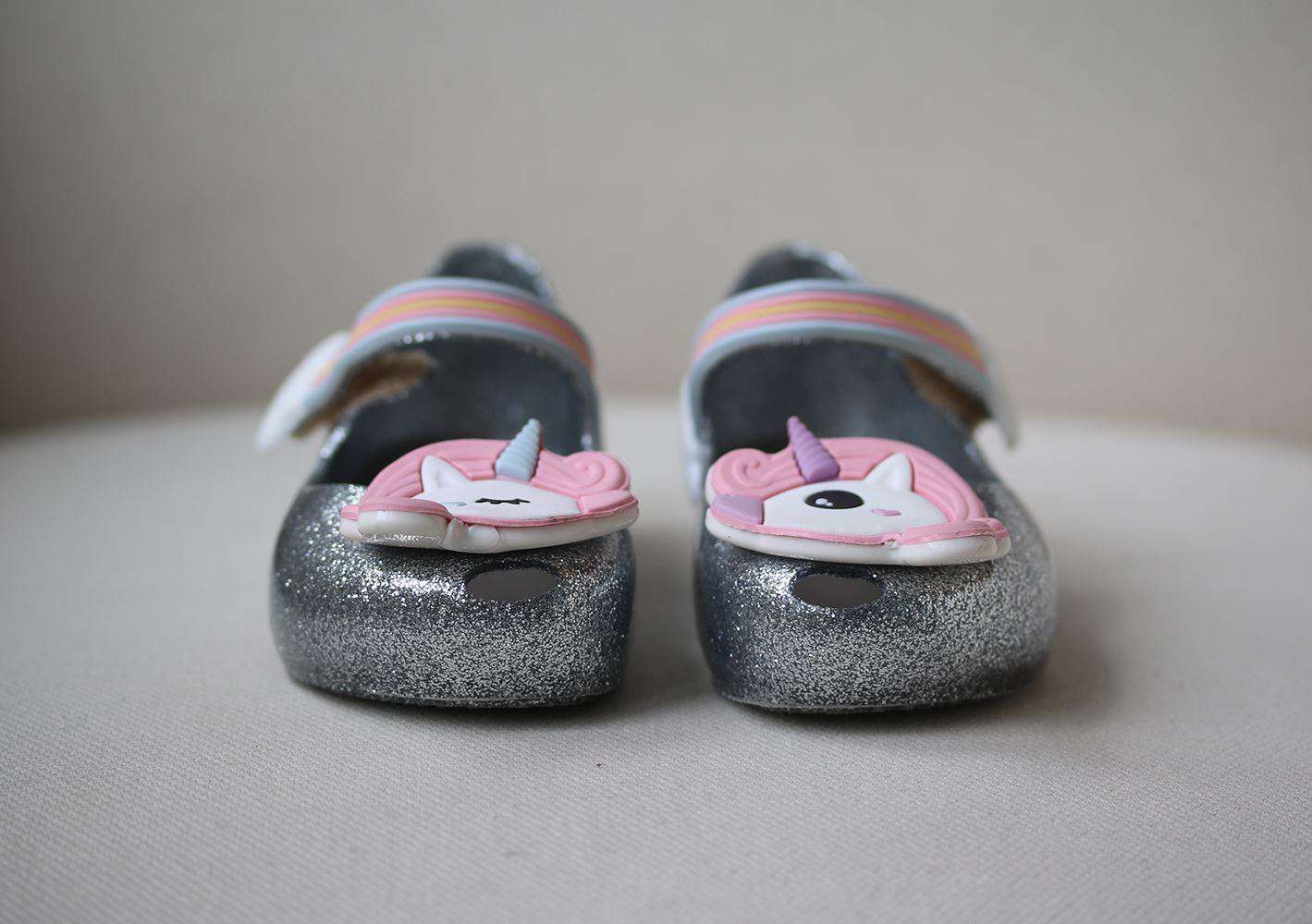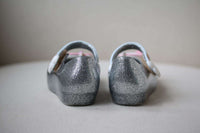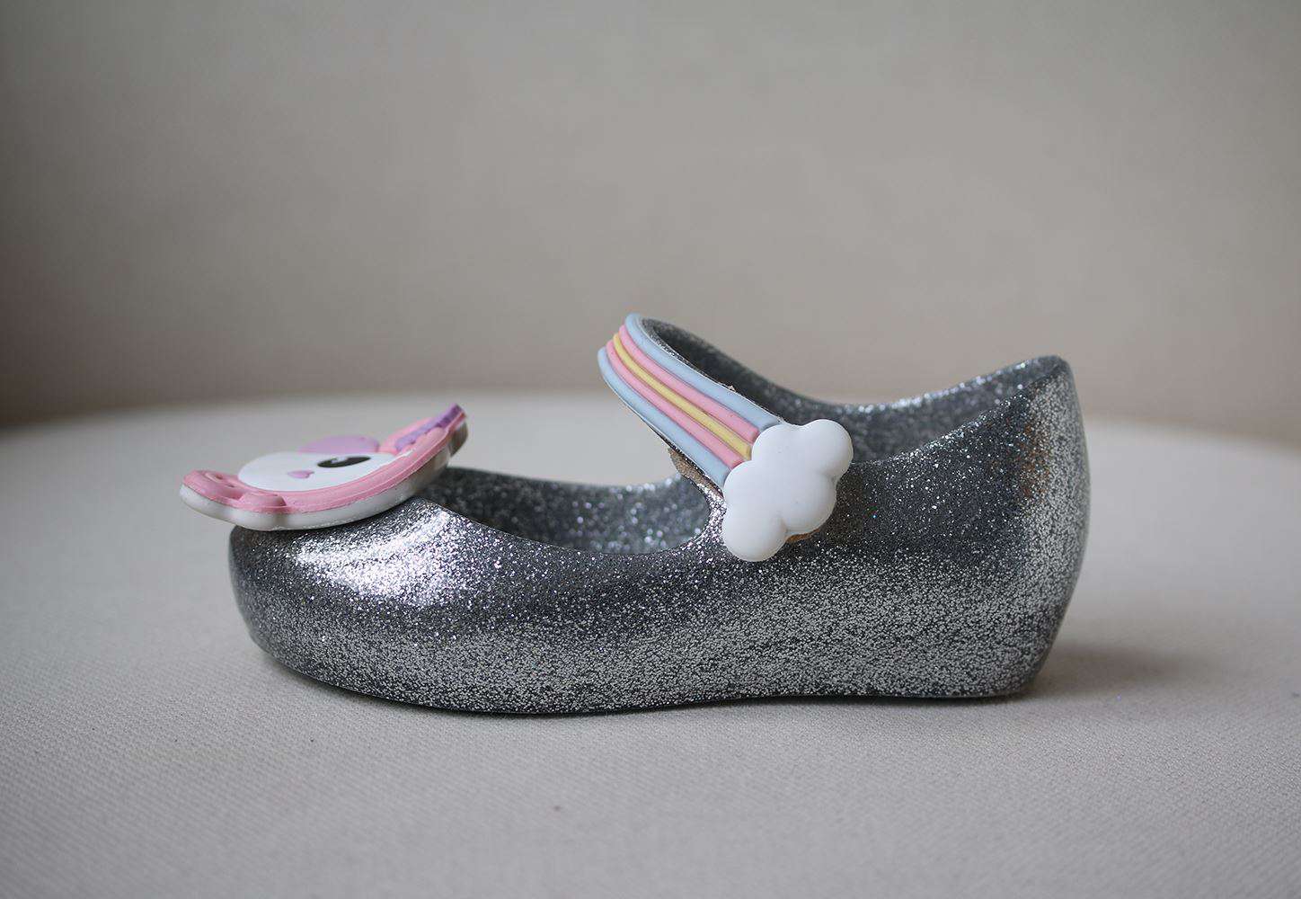 Girls silver glitter pumps by Mini Melissa. They have a unicorn character appliqué to the toes. Made in sweet scented soft and durable PVC. Peep toe detail and a hidden wedge heel. Padded inner sole and velcro fastening strap across the foot. Signature detailing to the inner sole.