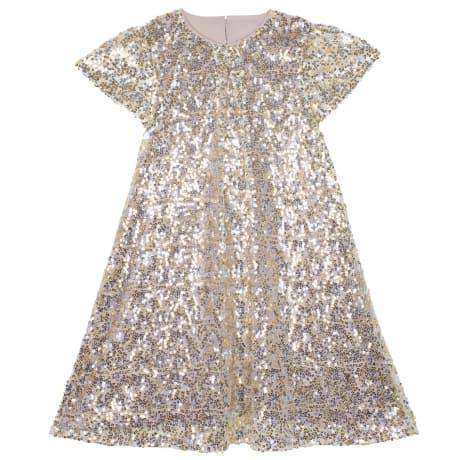 This simple Wild & Gorgeous silve and gold sequin girls Party Doll dress has a loose fitting A line shape, short sleeve and pleated neck detail. The relaxed way to sparkle and shine. Material: Outer: 100% polyamide. Lining: 100% viscose.
