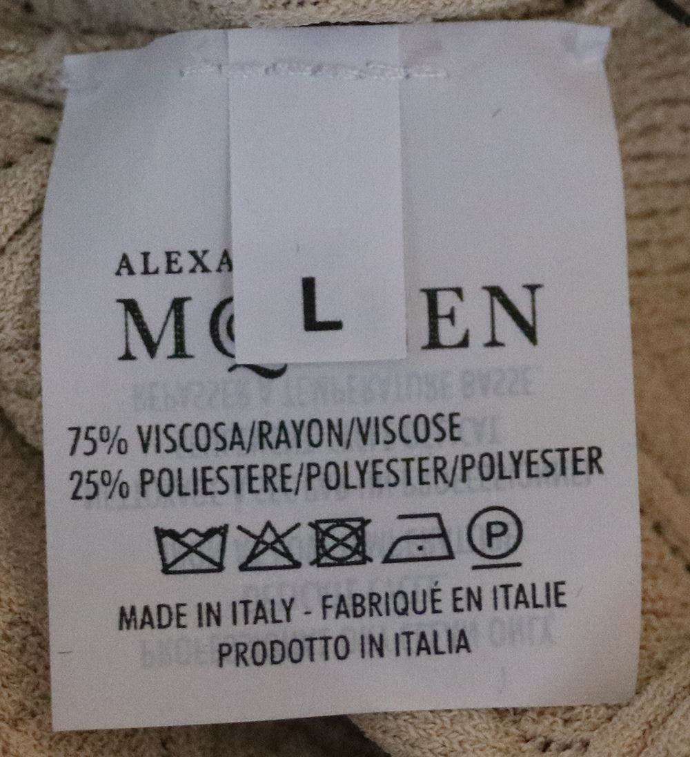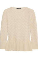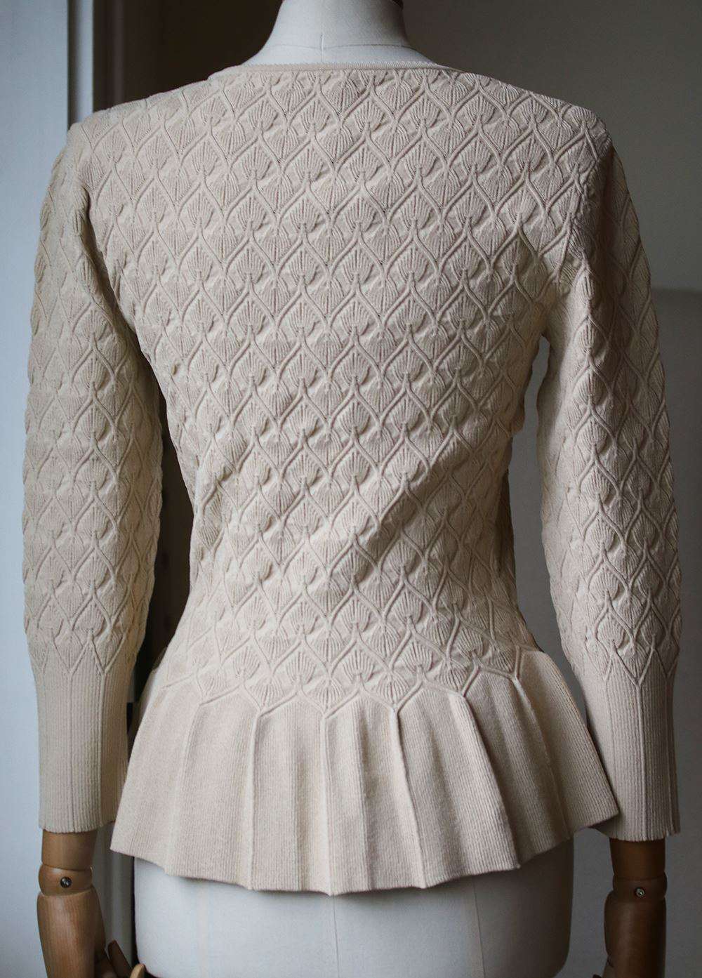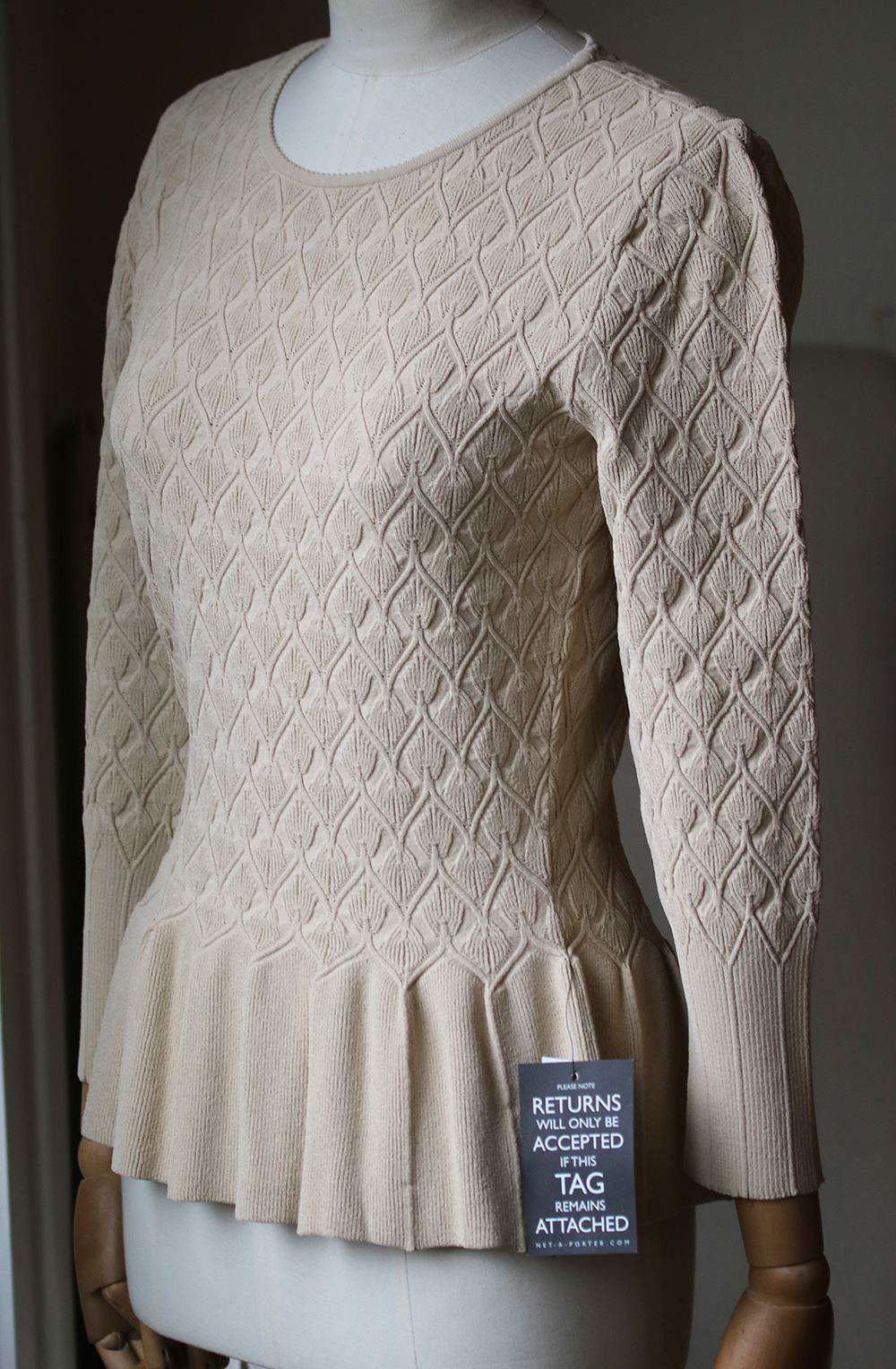 Alexander McQueen's knitted cream top has a flared peplum that creates the illusion of a cinched-in waist. Alexander McQueen cream top. Textured mid-weight viscose-blend. Peplum, ribbed trims. Slips on. 75% viscose, 25% polyester.