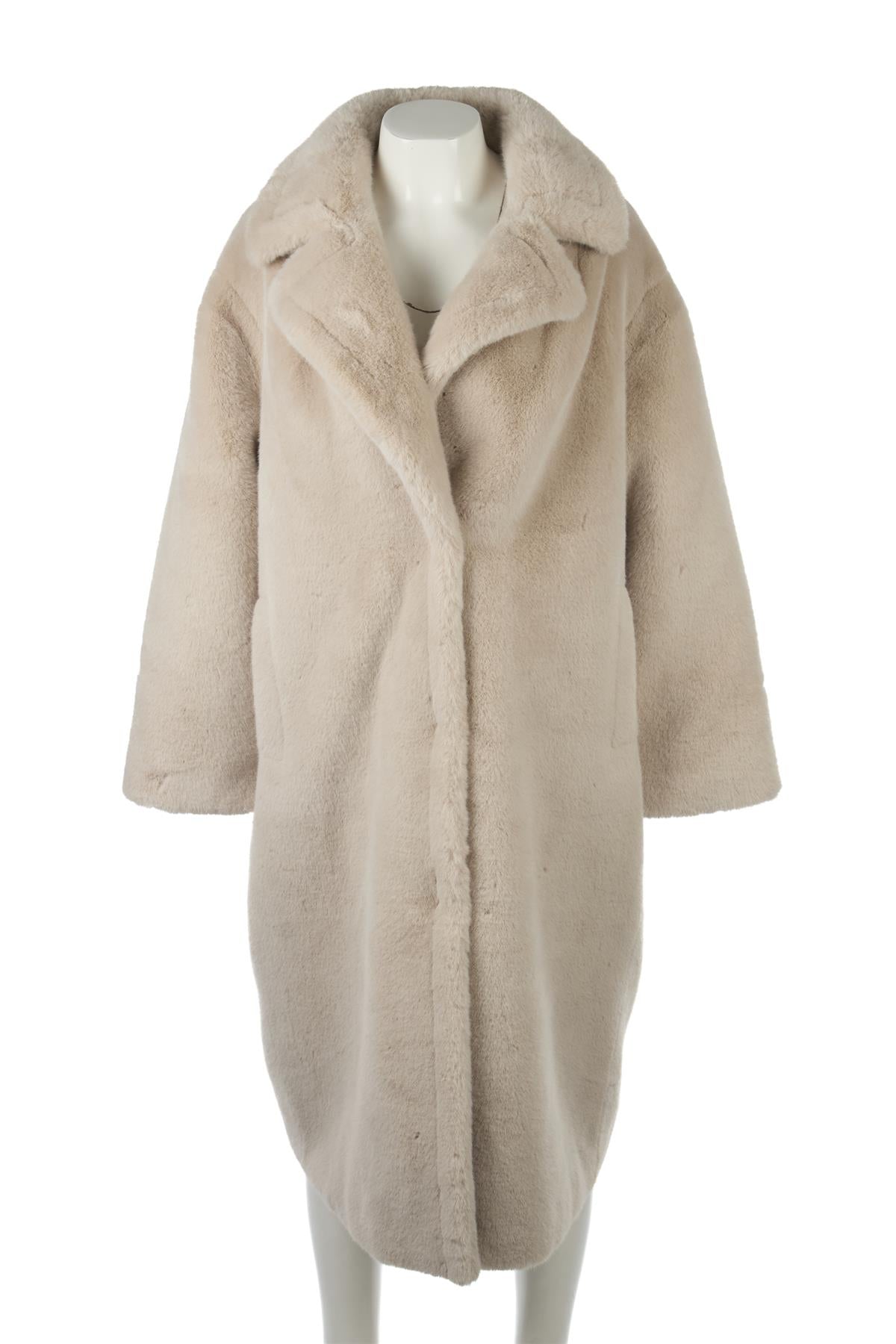 Stand Studio Beige Faux Fur Coat. Beige. Long Sleeve. Crewneck. Button fastening - Front. 100% Polyester. FR 34 (UK 6, US 2, IT 38). Shoulder to Shoulder: 19.5 in. Bust: 48 in. Waist: 50 in. Hips: 52 in. Length: 46 in.