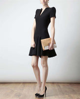 A sculptural neckline draws the eye to this artfully tailored leaf crepe design. V neckline short sleeves circle skirt concealed back zip about 22" from natural waist acetate/rayon dry clean made in italy
