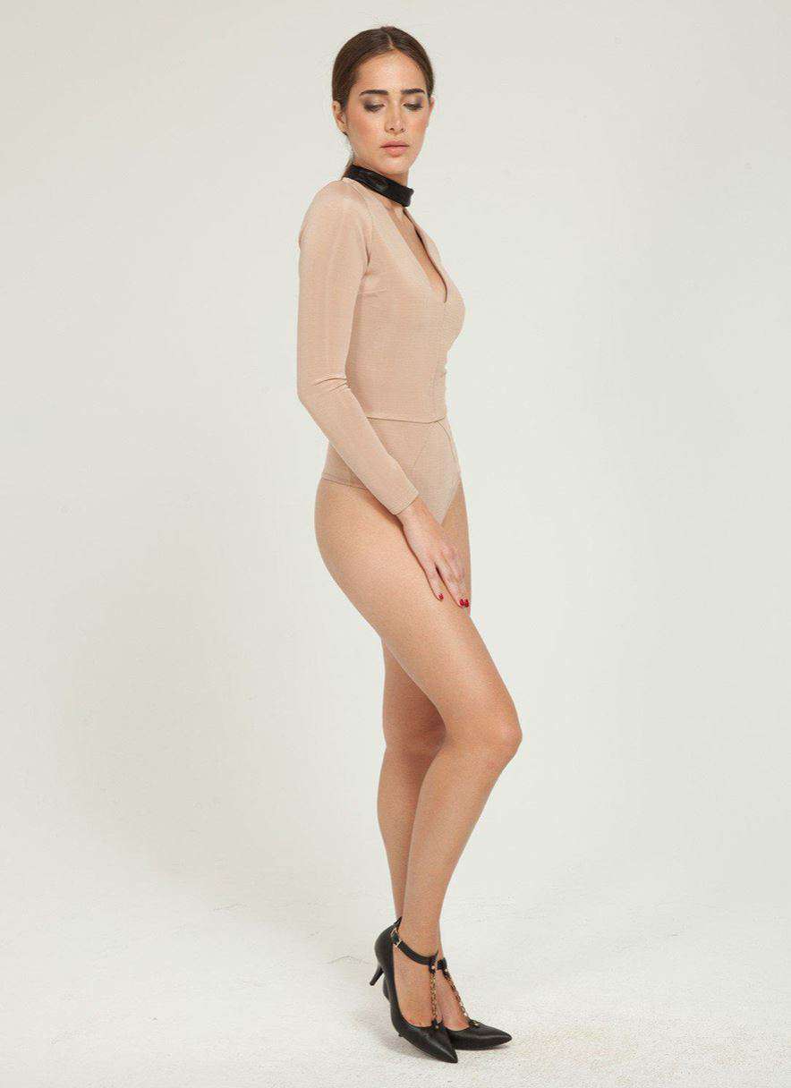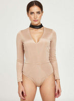 Our new favorite long-sleeve bodysuit with leather choker. Plunging neckline, darting at bust. Thong bottom. Wear it with the Leather A-line Skirt. 80% Viscose, 20% Polyamide.