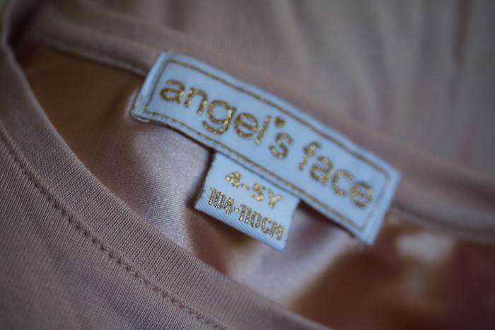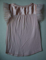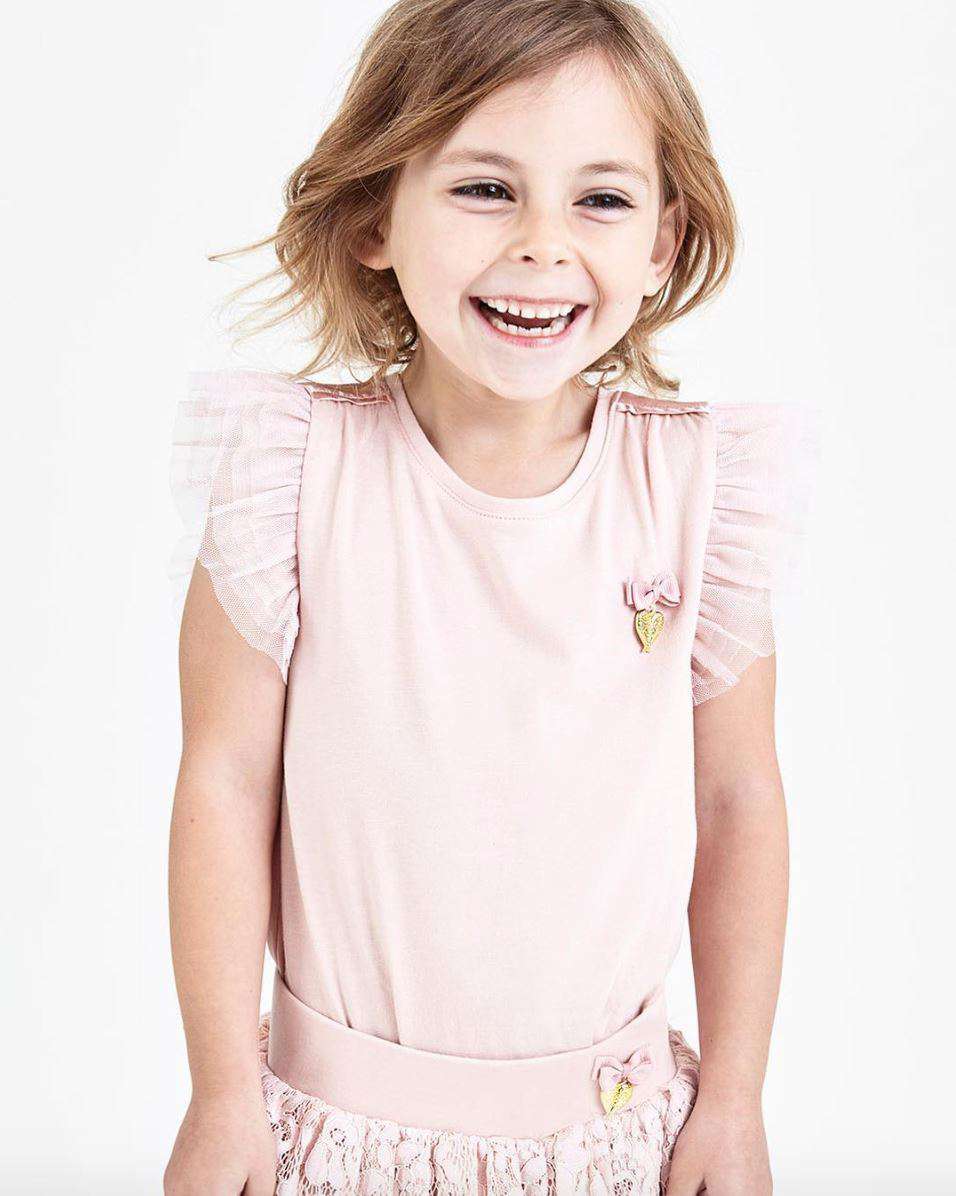 Soft cotton modal tee with tulle sleeves and satin trim. This elegant top is comfortable and stylish, with a satin back yoke and an Angel's Face charm and bow.