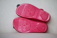 Girls bright pink, sweet scented jelly shoes by Mini Melissa. This cute design has a Minnie Mouse on one shoe and a Mickey Mouse on the other, just above the peep toe. They fasten with a velcro strap, which has two decorative metallic gold studs. They have a hidden heel, with a textured sole, a soft cushioned lining and a velco fastening. Size - EU 24 (UK 7, US 8)