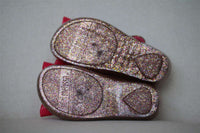 Girls pink and gold glittery, sweet scented jelly shoes by Mini Melissa. This cute design has fuchsia pink bow, just above the peep toe. They fasten with a velcro strap, which has two decorative metallic gold studs. They have a hidden heel, with a textured sole and a soft cushioned lining.   Size - EU 24 (UK 7, US 8)