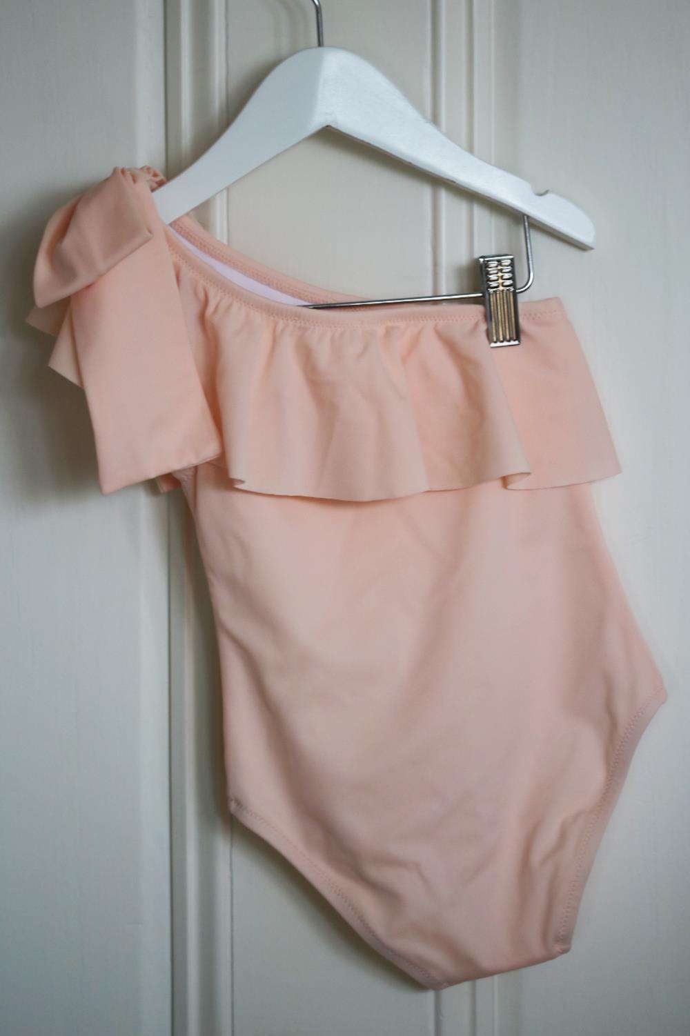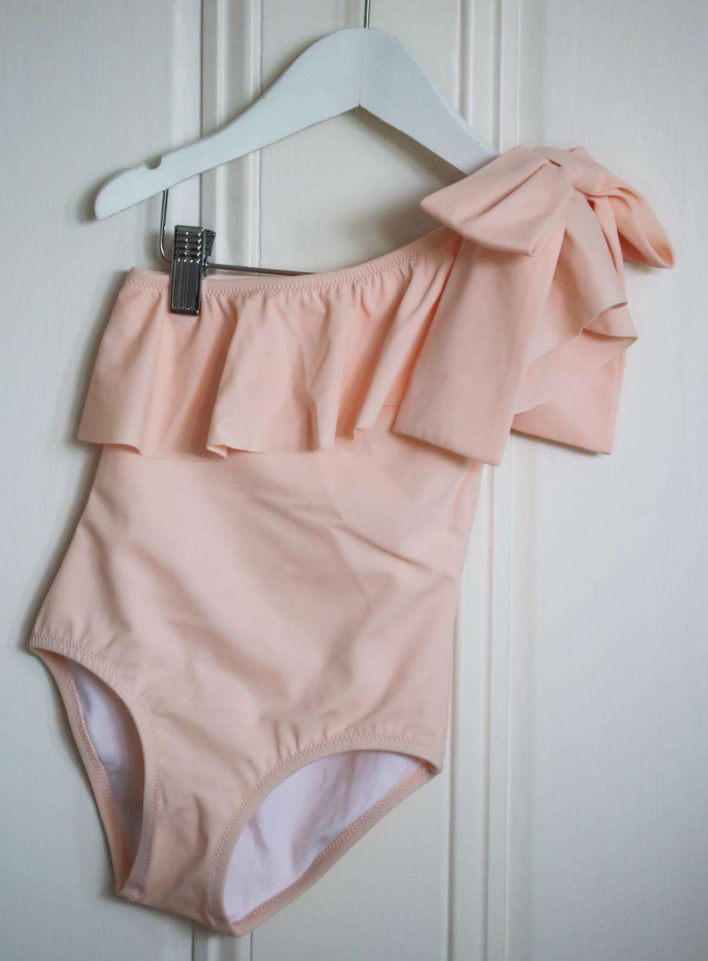 - Girls one shoulder peach pink swimsuit by Phi Clothing, made in silky, stretchy polyamide.