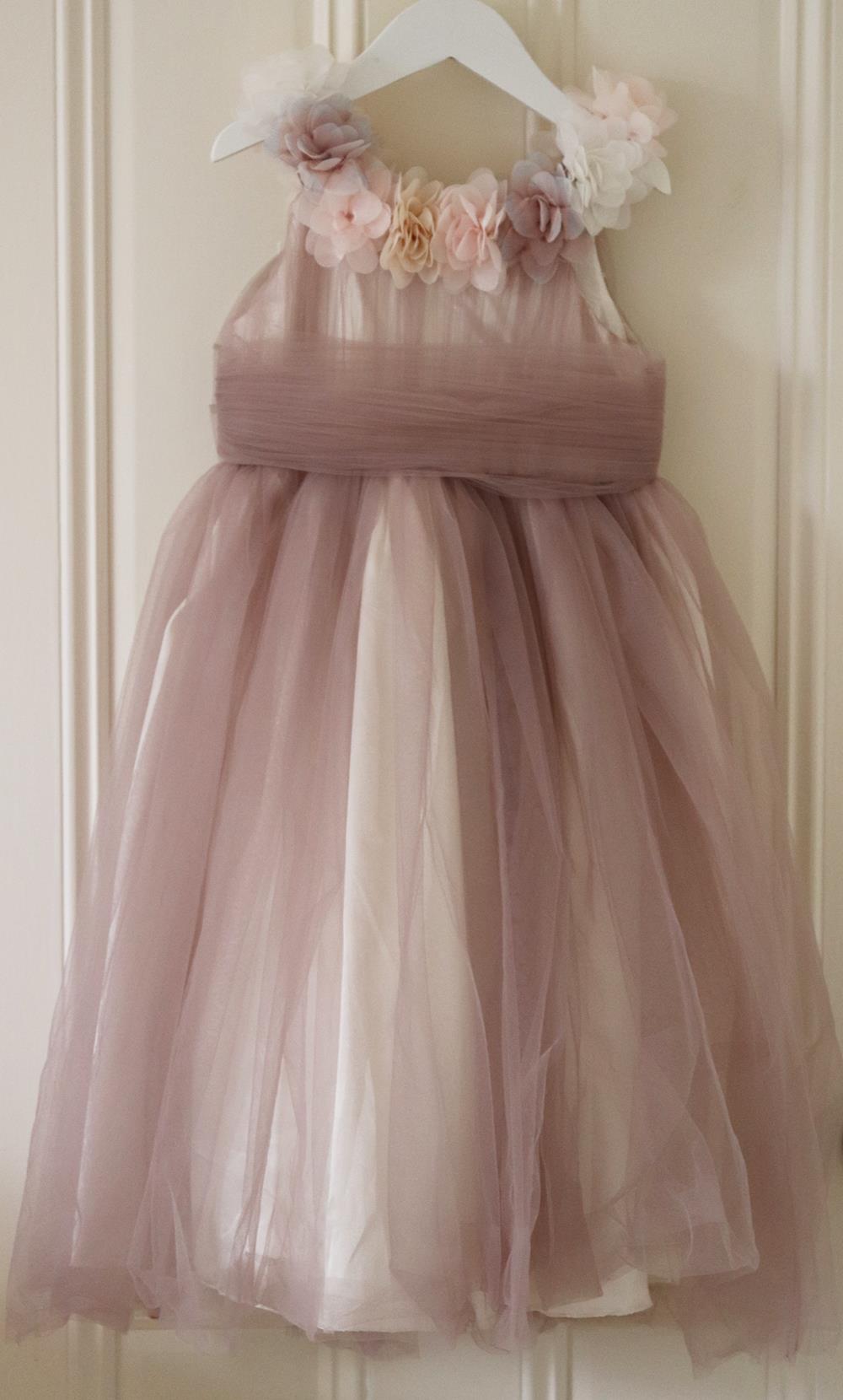 - Girls beautiful dusky pink dress from Romano Princess, with fabric flowers in shades of pink around the neckline.