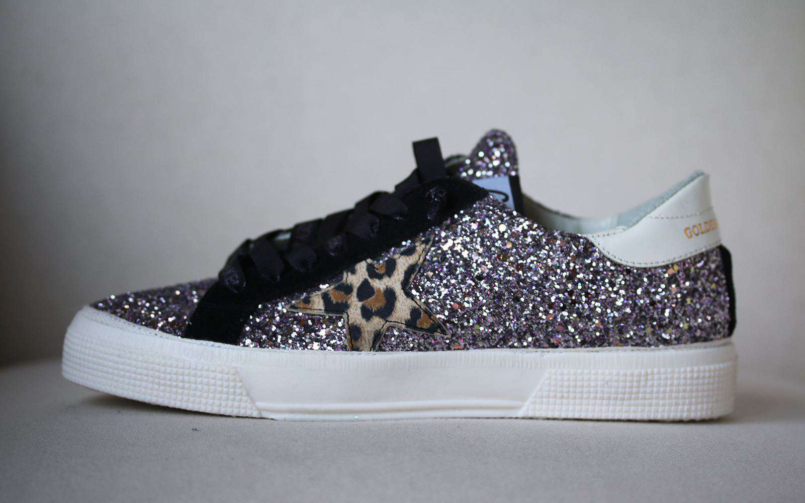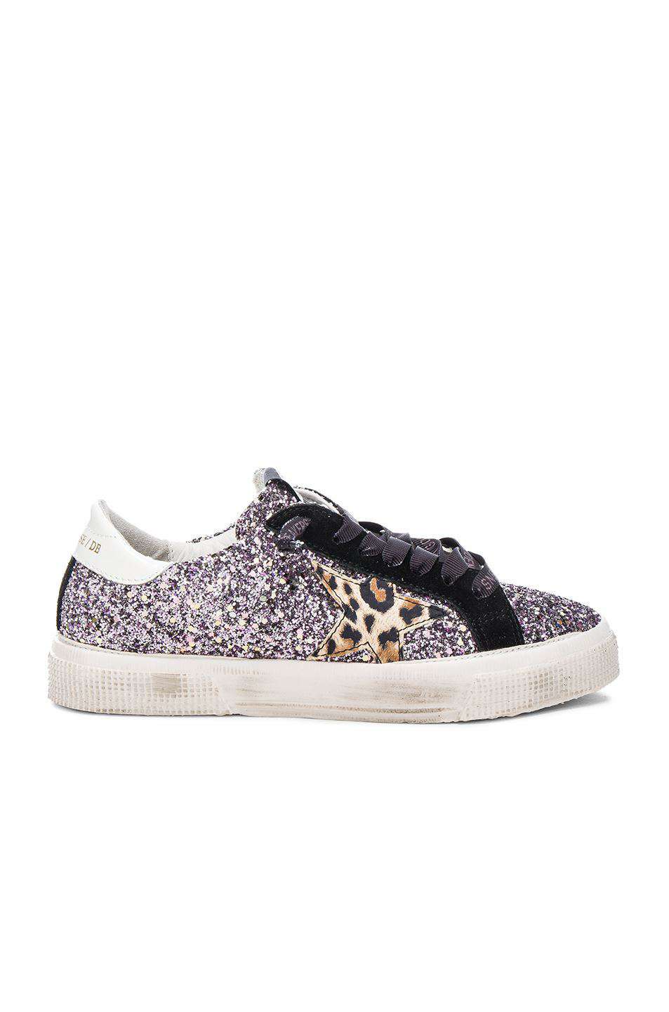 This eye-catching pair of 'May' sneakers by Golden Goose Deluxe brand have been made in Italy from leather that's saturated with purple glitter. They're appliquéd with the label's signature star made from leopard-print leather and a white back panel stamped with the brand logo. The sole has been distressed by hand to stop them looking too box-fresh. Heel measures approximately 20mm/ 1 inch. Purple glittered leather. Lace-up front. Made in Italy.