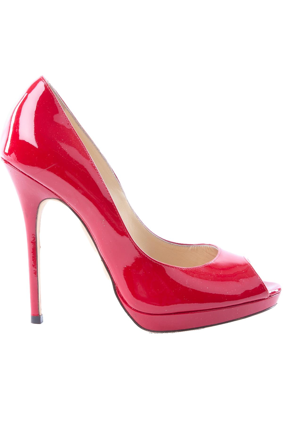 Jimmy Choo Red Patent Leather Pumps. Red. Slips on. Does not come with - dustbag or box. EU 37.5 (UK 4.5, US 7.5). Insole: 9.25 in. Heel Height: 3.5 in.