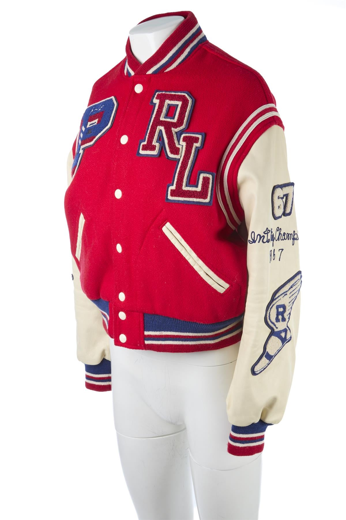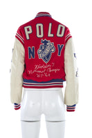 Polo Ralph Lauren Red Wool Jacket. Red, cream and navy.. Long Sleeve. Crewneck. Button fastening - Front. 60% Wool, 40% Polyester, 100% Cotton, 100% Leather. Small (UK 8, US 4, FR 36, IT 40). Shoulder to Shoulder: 21 in. Bust: 44 in. Waist: 43 in. Hips: 38 in. Length: 23.5 in.