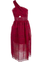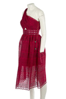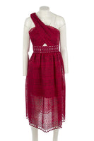 Self-Portrait Burgundy Broderie Anglaise Midi Dress. Burgundy. Sleeveless. Asymmetric. Zip fastening - Side. 100% Polyester. UK 10 (US 6, FR 38, IT 42). Bust: 30 in. Waist: 27 in. Hips: 38 in. Length: 39 in.