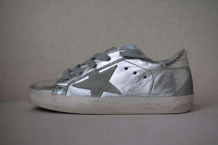 Limited edition silver leather trainers by Golden Goose for Bonpoint with their signature distressing and star patch.