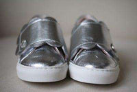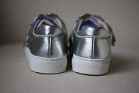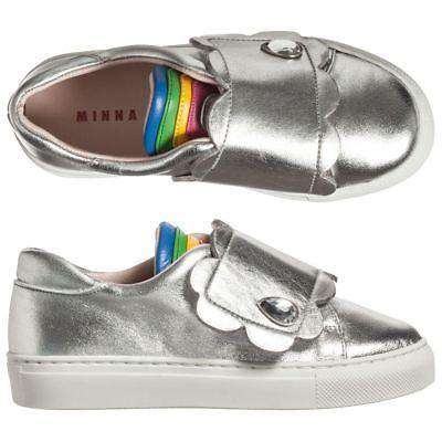 Minna Parikka Shoes. Sparkly silver low-tops with scalloped edges, add a touch of glamour to a girl's footwear. Made in smooth leather, these mini-me, Minna Parikka 'Puff Silver' sneakers have a velcro strap with gem decoration and a rainbow stitched tongue. They have a cushioned inner sole and a non-slip rubber outer sole.