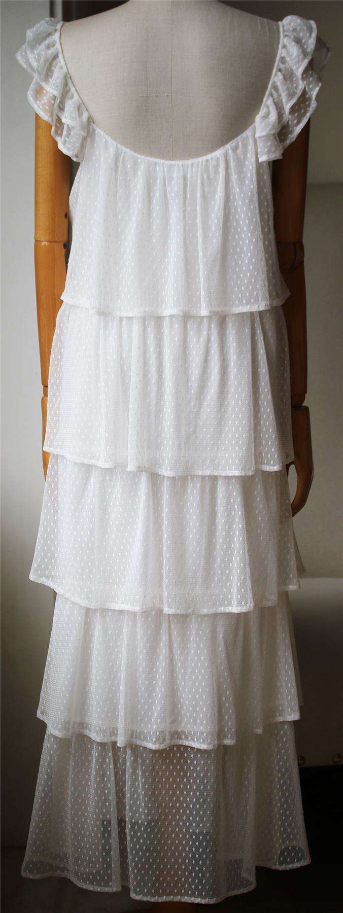 100% polyester. Fully lined. Tiered ruffle layers. Polka dot mesh fabric.