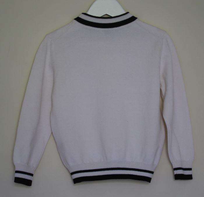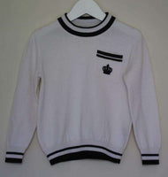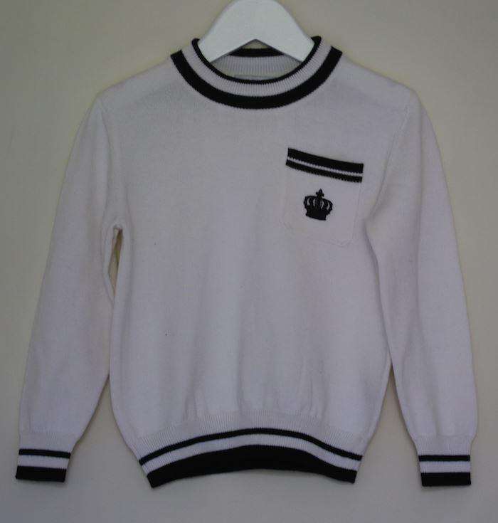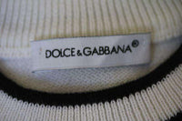 White sweater by Dolce & Gabbana with a black trim and embroidered crown detail.
