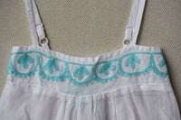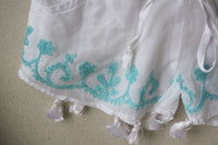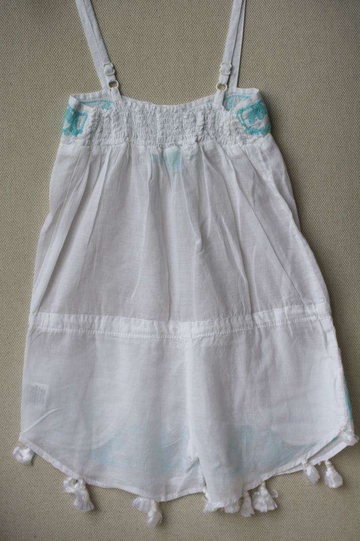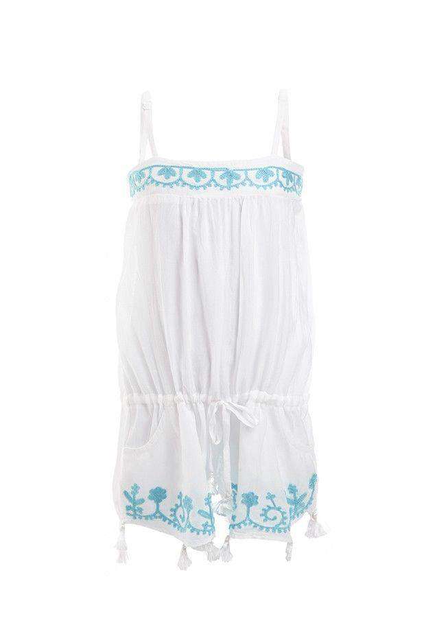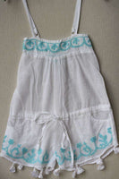 Light cotton playsuit with embroidered trims featuring side pockets, drawstring drop waist, and silk bohemian tassels along the bottom.