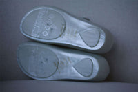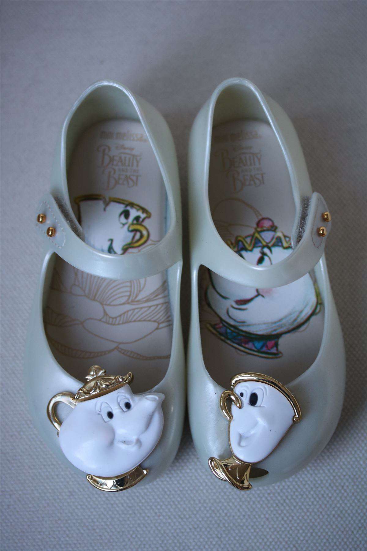 These pearl white ballerina pumps by Mini Melissa, have a Disney© Beauty and the Beast 'Mrs Potts and Chip' character appliqué and inscription on the inner sole. Made in sweet scented soft and durable rubber, with the designer's signature peep toe and hidden wedge heel, adding feminine design details. Size - EU 27 (UK 9, US 10)