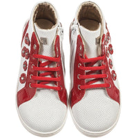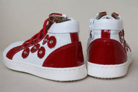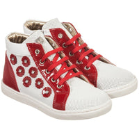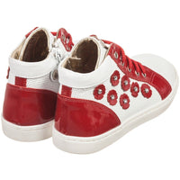 - White patent lace-up Monnalisa hi-top trainers with shiny red leather trim and a gold leather lining.