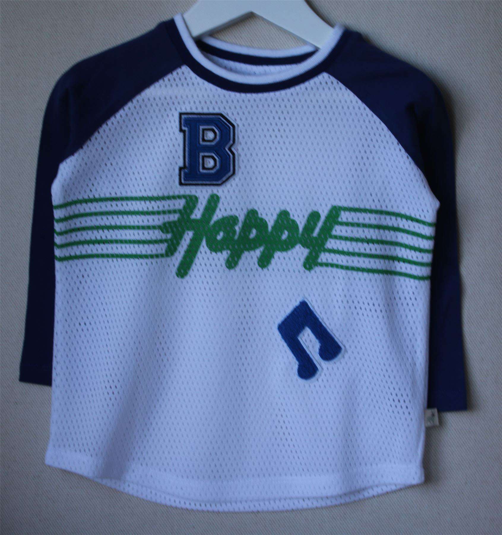 Stella McCartney Kids Max raglan top with badges and 'B Happy' design on the front.