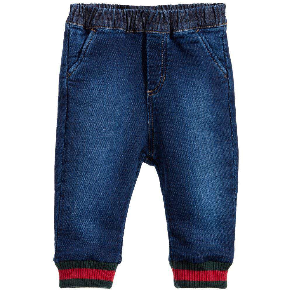 Baby boys blue jog jean trousers by Gucci. Made in soft cotton jersey, they have an elasticated waistband and ribbed ankle cuffs in the designer's green and red. They have two small side pockets and one at the back. Size - 12-18 Months