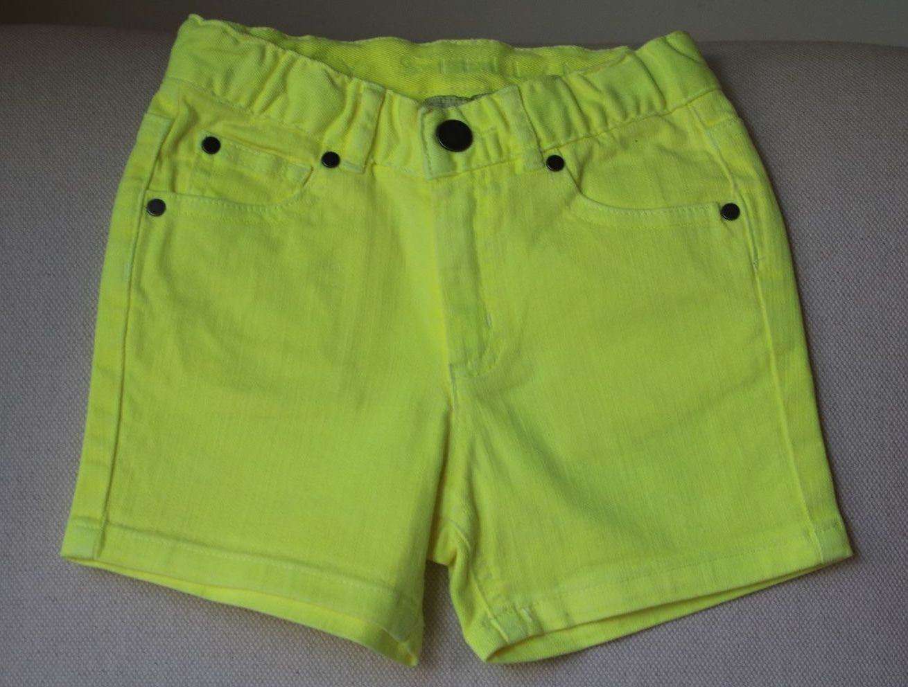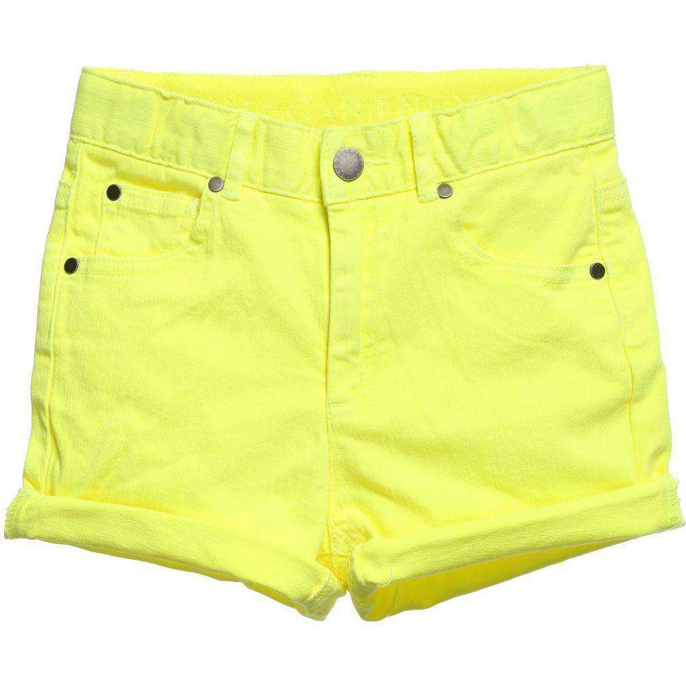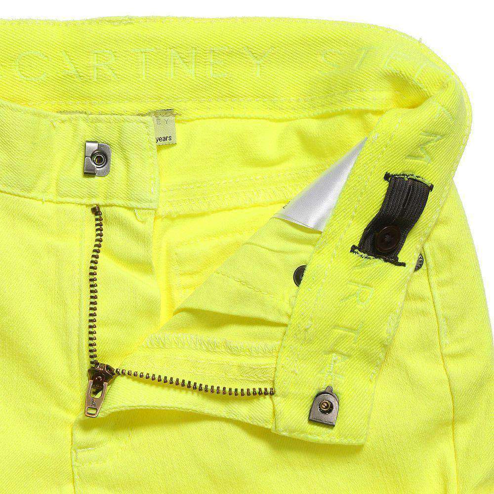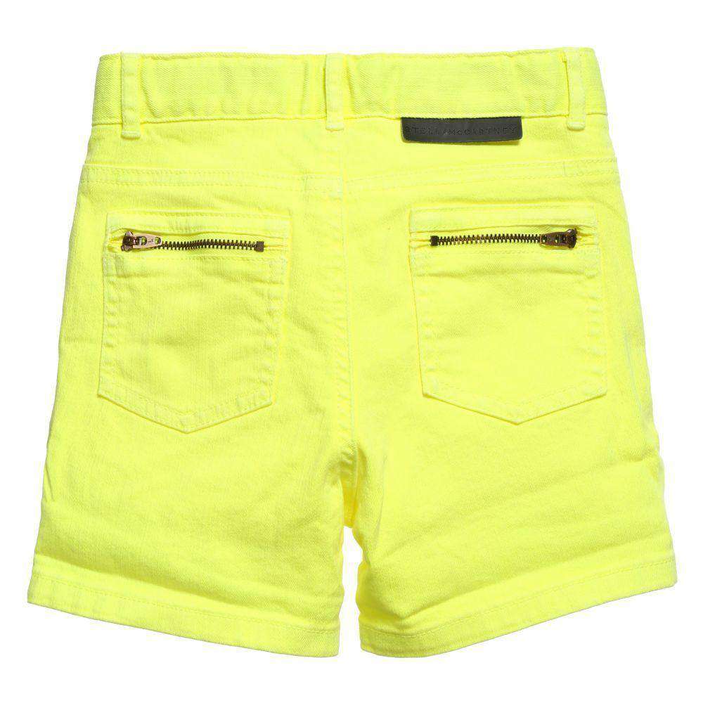 Stella McCartney Shorts. Girls cool, bright neon yellow denim shorts by Stella McCartney Kids. In a short, sporty style they can be worn in the traditional way or with a pair of tights underneath. There is an adjustable waistband on all sizes that means they can be made smaller for slimmer children Size - 2 years Ref: SB21