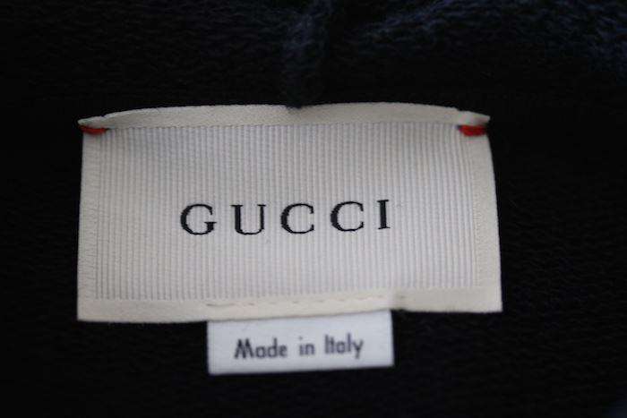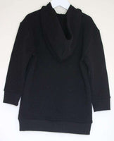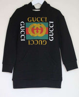 Girls luxurious black hooded dress from Gucci. Made in soft, mid-weight felted cotton jersey, with a vintage logo inspired by the adults' collection. It has a front pouch pocket and raw-edged seams on the collar