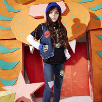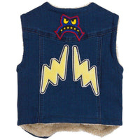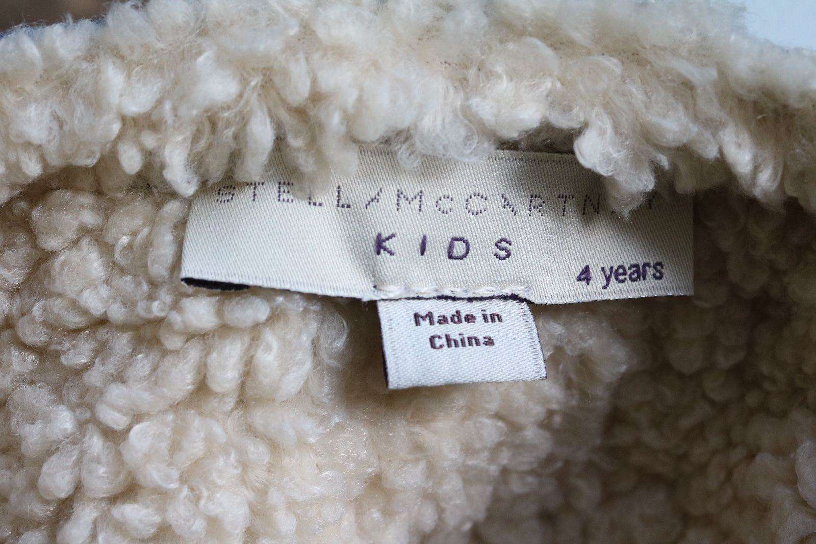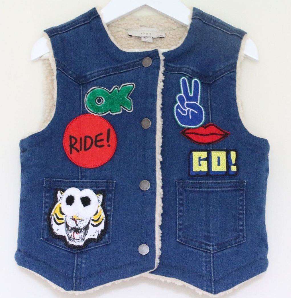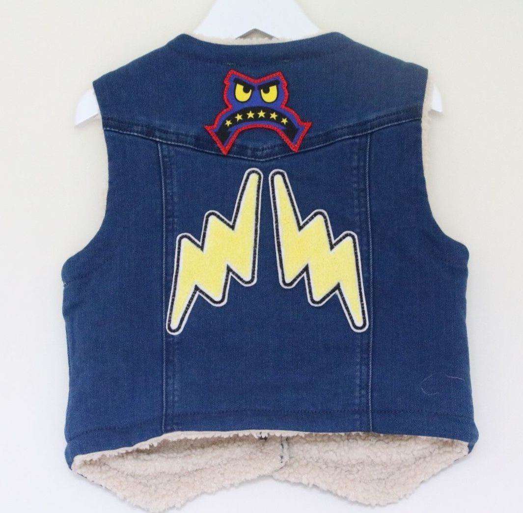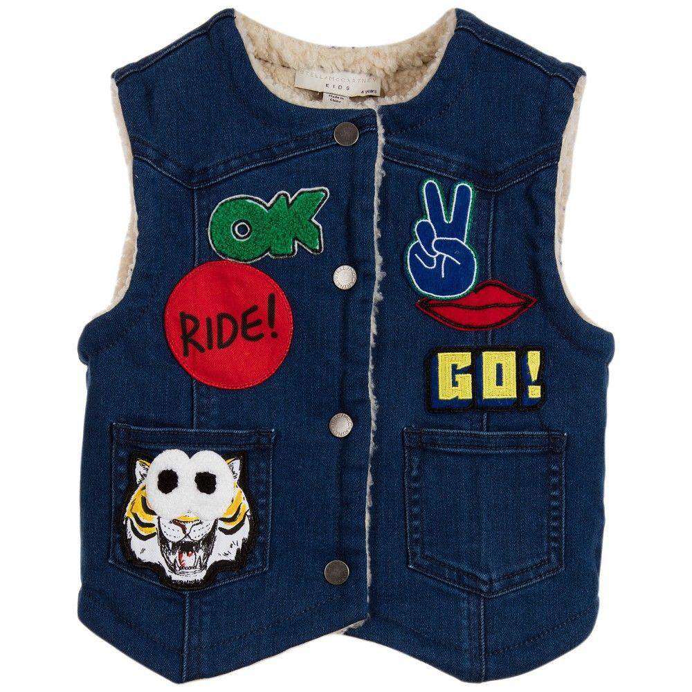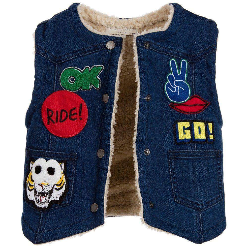 Stella McCartney Kids Waistcoat. Blue denim waistcoat by Stella McCartney Kids. This sleeveless gilet is made with organic cotton and is embroidered with fun badges on the front and back, with popper fastening, a curved hem and front pockets. It is fully lined with a synthetic shearling for warmth and comfort. Size - 4 years RRP: £74 Ref: SBJ1