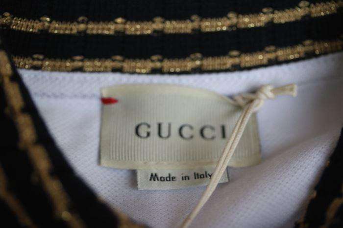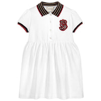 A soft cotton piqué polo dress for girls by luxury brand Gucci. This white short sleeve dress has red, navy blue and gold trims and has a 'G' embroidered badge on the chest. The dress fastens on the front with small branded buttons.