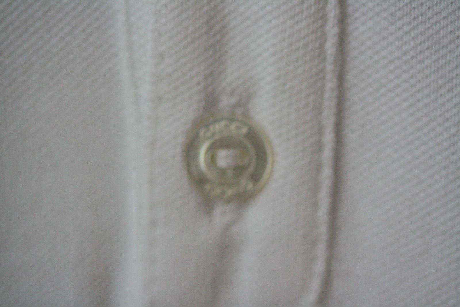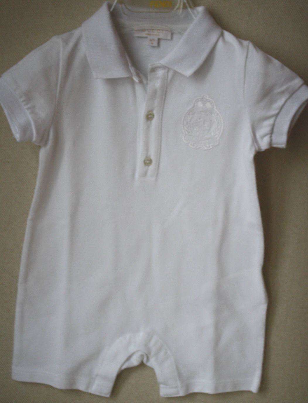 Cute white Gucci shortie. Polo shirt style romper with buttons on the front. It has short sleeves and an embroidered designer logo on the chest. There are poppers between the legs for easy dressing.