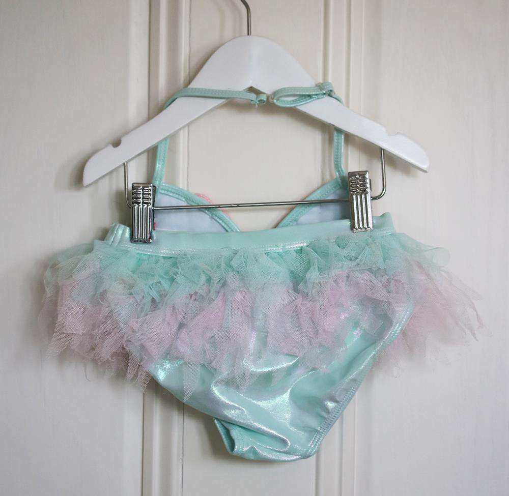 - A pink and blue, mermaid inspired bikini by Kate Mack & Biscotti.
