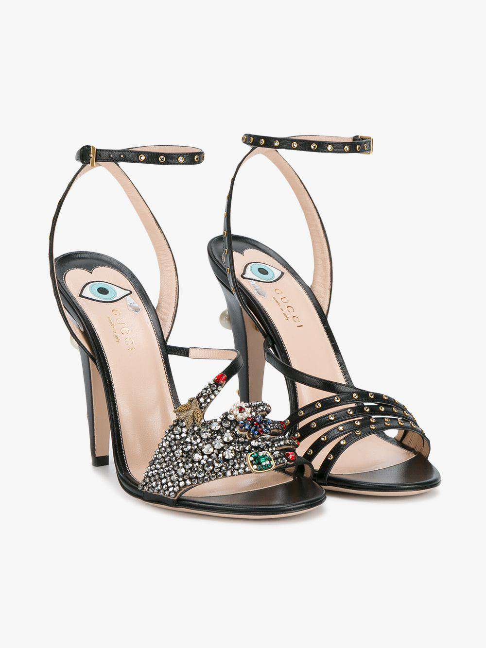 Constructed in Italy according to gucci's exacting standards, these black leather sandals will add a decorative flourish to even the most off-duty of days. The ideal choice for dressing up or down, these intricately detailed gucci sandals are characterized by the crystal embellished hand applique adorning the front strap. Hand sewn, this ornamentation offsets the sleek silhouette of these high heeled open toe sandals. Leather/Glass. Colour: black.