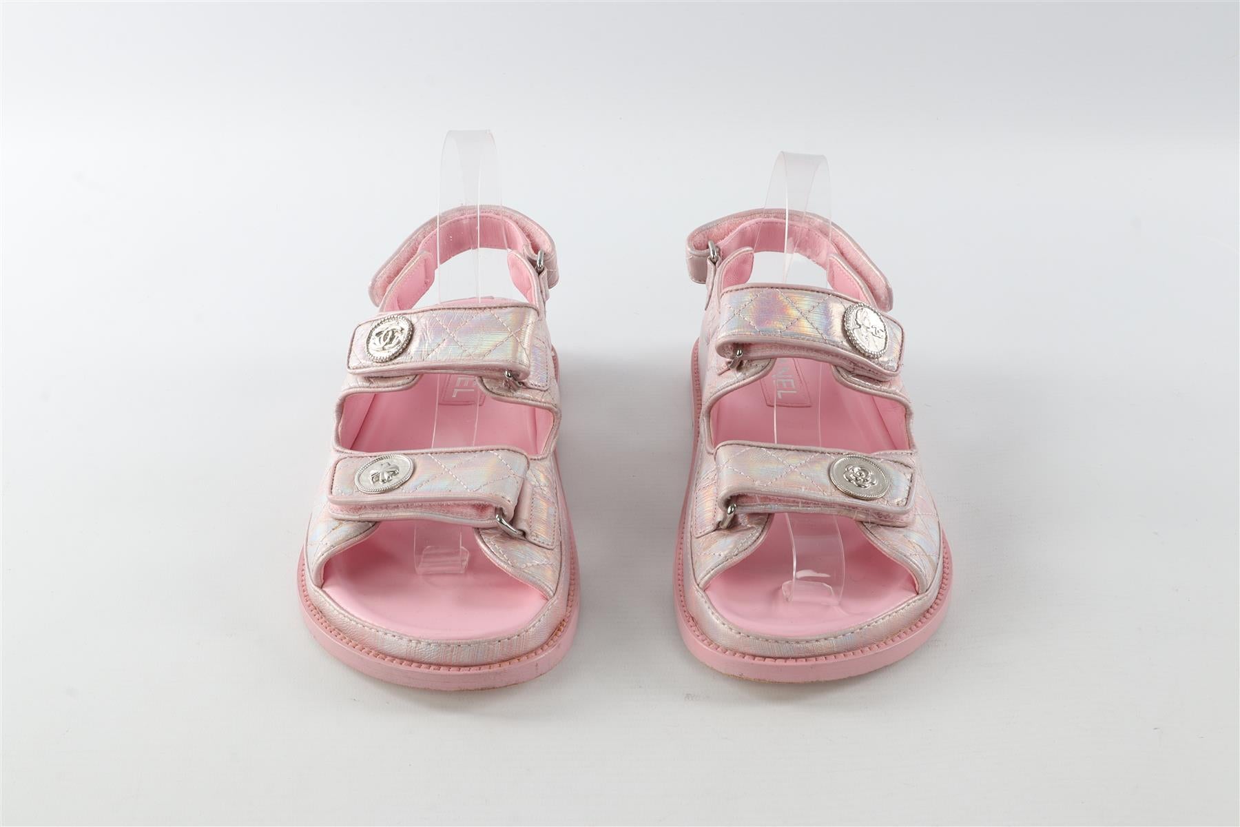 Chanel Pink 2022 Dad Quilted Leather Sandals. Pink. Slips on. Does not come with - dustbag or box. EU 38 (UK 5, US 8). Insole: 10 in. Heel Height: 1.2 in.